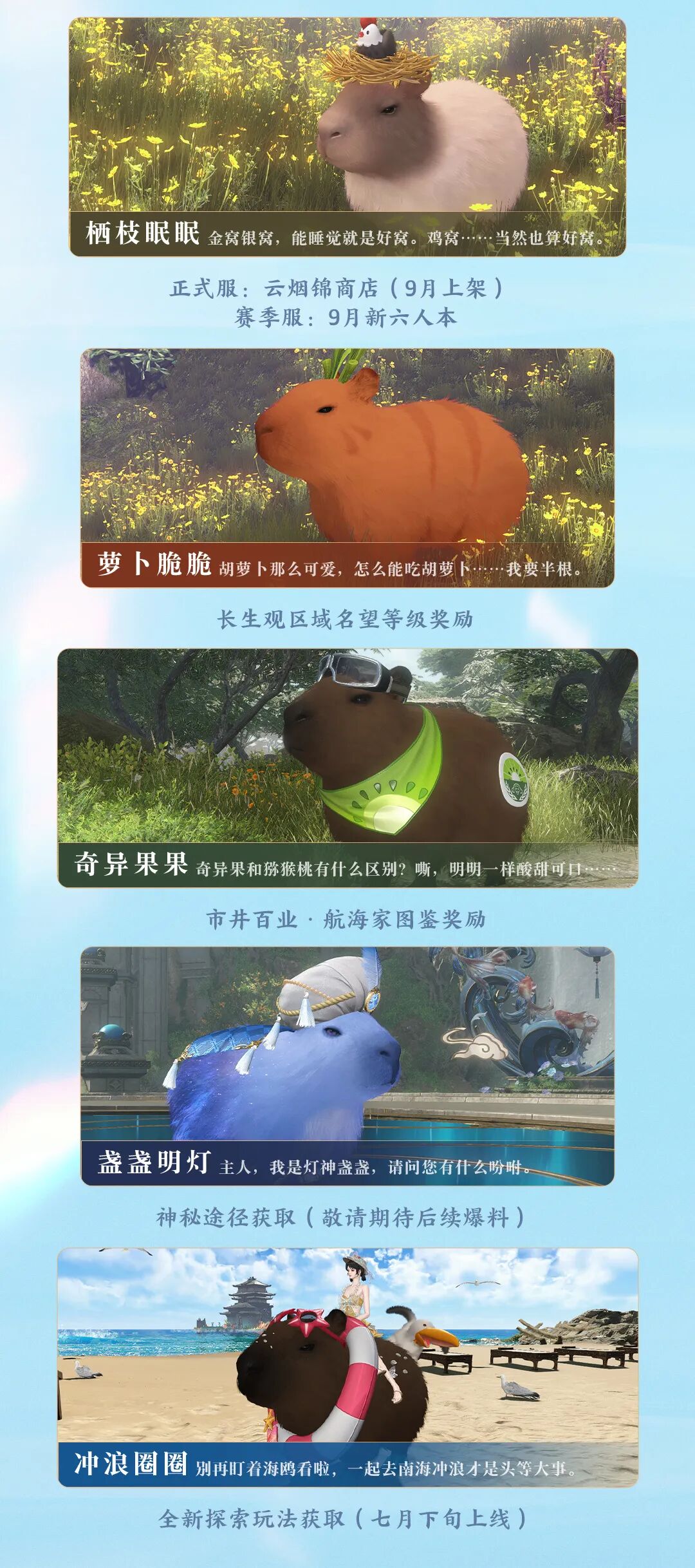 此外,在7月11日更新后,全服将新增【坐骑图鉴】,各位同门收集【怒海狂澜】版本中的部分祥瑞坐骑,不仅可以获得珍稀外观兑换券,还可带走超可爱卡皮巴拉祥瑞【桃兔绒绒】、可冲浪背饰、专属头像等超多好礼,全方面美出天际!