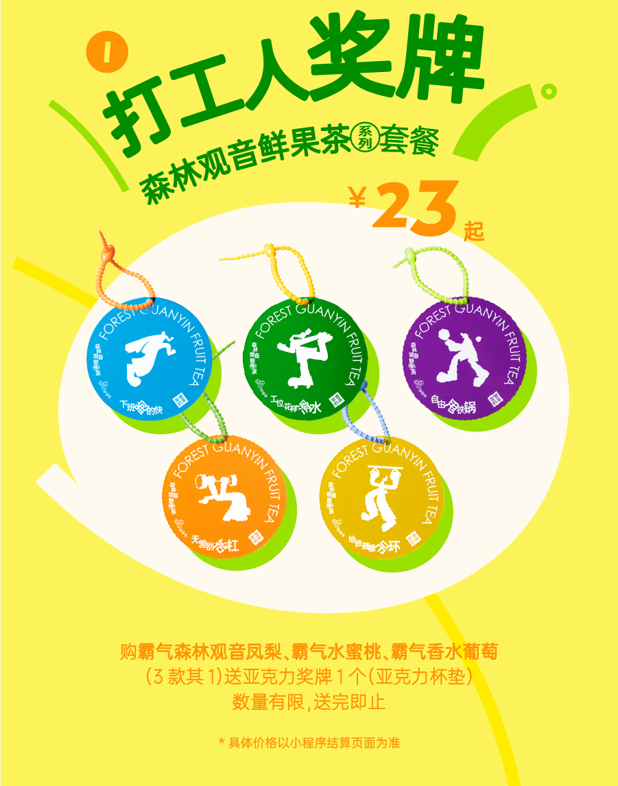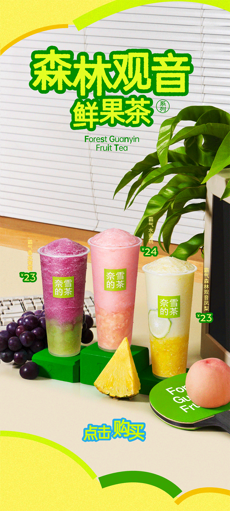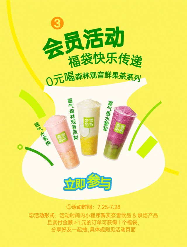 奈雪打工人运动会开幕 工位投篮 下班冲刺 带薪划水在生活的运动场 每天都有新挑战 不惧失败 勇往直前 喝森林观音鲜果茶 为自己喝彩 中场休息喝杯茶 头脑放松灵感发 前调:绵柔焙火香 中调:鲜爽水果香 后调:悠悠然花香 源自安溪高山之间的森林观音,得清风雨露的滋养,以传统手法烘焙制茶,焙出茶干紧实,色泽油润的高香乌龙茶。沸水冲泡,漾开悠悠花果香,柔柔观音韵,滋味绵长。森林茶香 如风拂过 轻啜茶汤,香气在喉间绽放 刹那间,仿佛亲至草木水涧,聆听自然的呼吸 即使身处都市,囿于格子间 也能透过茶香感受森林观音韵 香浓甜蜜,梨争上游 坚硬外表下暗藏甜蜜力量 果肉黄金水灿,柔嫩多汁 甜美中又夹着一丝丝酸爽 灵动多层次的口感令人着迷 霸气森林观音凤梨 前调:浓郁甜蜜凤梨香如阳光热烈 中调:香醇生椰乳交织清新柠檬香 后调:森林观音花香果香婉转绵长 一网打尽,“桃”你欢心 精选应季个大饱满水蜜桃 汁水丰润,果肉绵软无渣 咕嘟嘟大口吸入 桃香席卷嗅觉味觉 只为桃你欢心 让你桃离班味 霸气水蜜桃 前调:浓郁桃香磅礴喷涌 中调:绵软桃肉化舌尖 尾调:甘醇茶香喉韵悠长 鲜甜多汁,实力靠“葡” 晒足阳光的巨峰葡萄 积蓄饱满甜份 果肉丰厚且脆实 手剥果肉入茶 吸得到弹嫩爽口 霸气香水葡萄(首创) 前调:清新葡萄微透玫瑰香 中调:果肉多汁口口爆脆 后调:茶韵清逸唇齿留香 森林观音鲜果茶系列套餐 小程序活动价 23元起 购霸气森林观音凤梨、霸气水蜜桃、霸气香水葡萄(3款其1)送亚克力奖牌1个(亚克力杯垫),数量有限,送完即止 *具体价格以小程序结算页面为准 奈雪打工人运动会 5环套圈赢奖品 活动细则:7/25-7/27期间,到奈雪下线门店消费满38元,凭消费小票,即可得5个环套圈,套中即可得相应奖品,奖品包含但不限于保温杯、变色杯等,具体活动奖品以门店为主。福袋快乐传递 0元喝森林观音鲜果茶系列 ①活动时间:7.25-7.28 ②活动形式:活动时间内小程序购买奈雪饮品&烘焙产品且实付金额≥1元的订单可获得1个福袋,分享好友一起抽,具体规则见活动页面 你的打工状态是——?评论区请10位打工人喝霸气森林观音鲜果茶