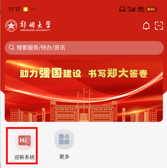 ①通过“郑州大学移动校园”APP→选择“迎新系统”,点击进入迎新系统首页。