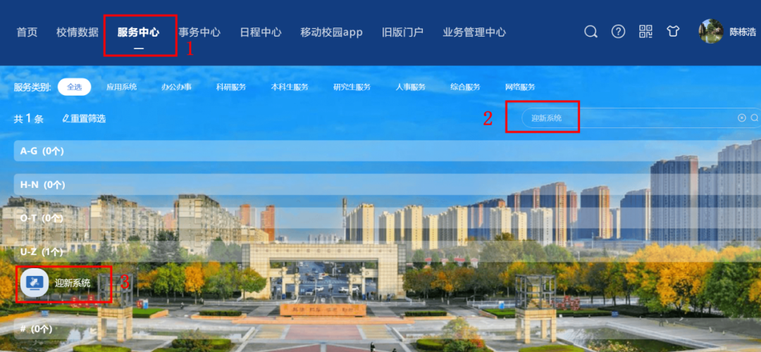 ①点击服务中心→选择“迎新系统”,进入“迎新系统”首页;