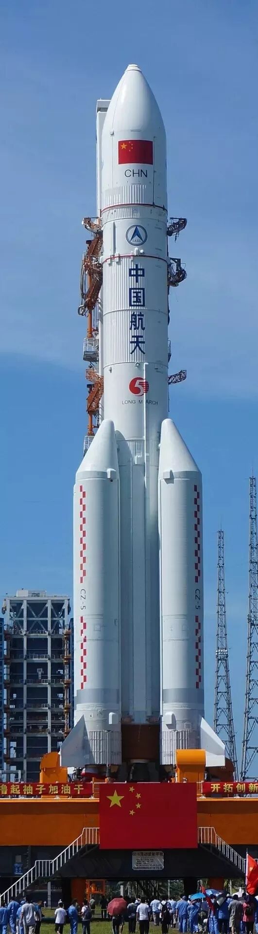 长征五号运载火箭,身高57米,腰围15.7米以上(直径5米),相比其他腰围仅有10米多的火箭兄弟们(直径3.35米)来说,它真是一个“大块头”,因此被大家亲切地称之为“胖五”。