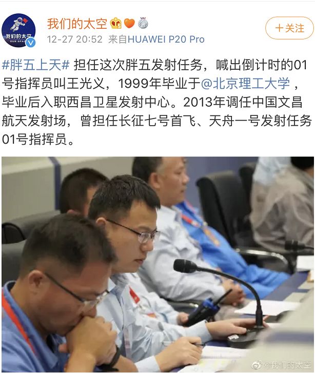 在长征五号01指挥员、北京理工大学校友王光义的倒计时声中,长征五号遥三运载火箭腾空而起!