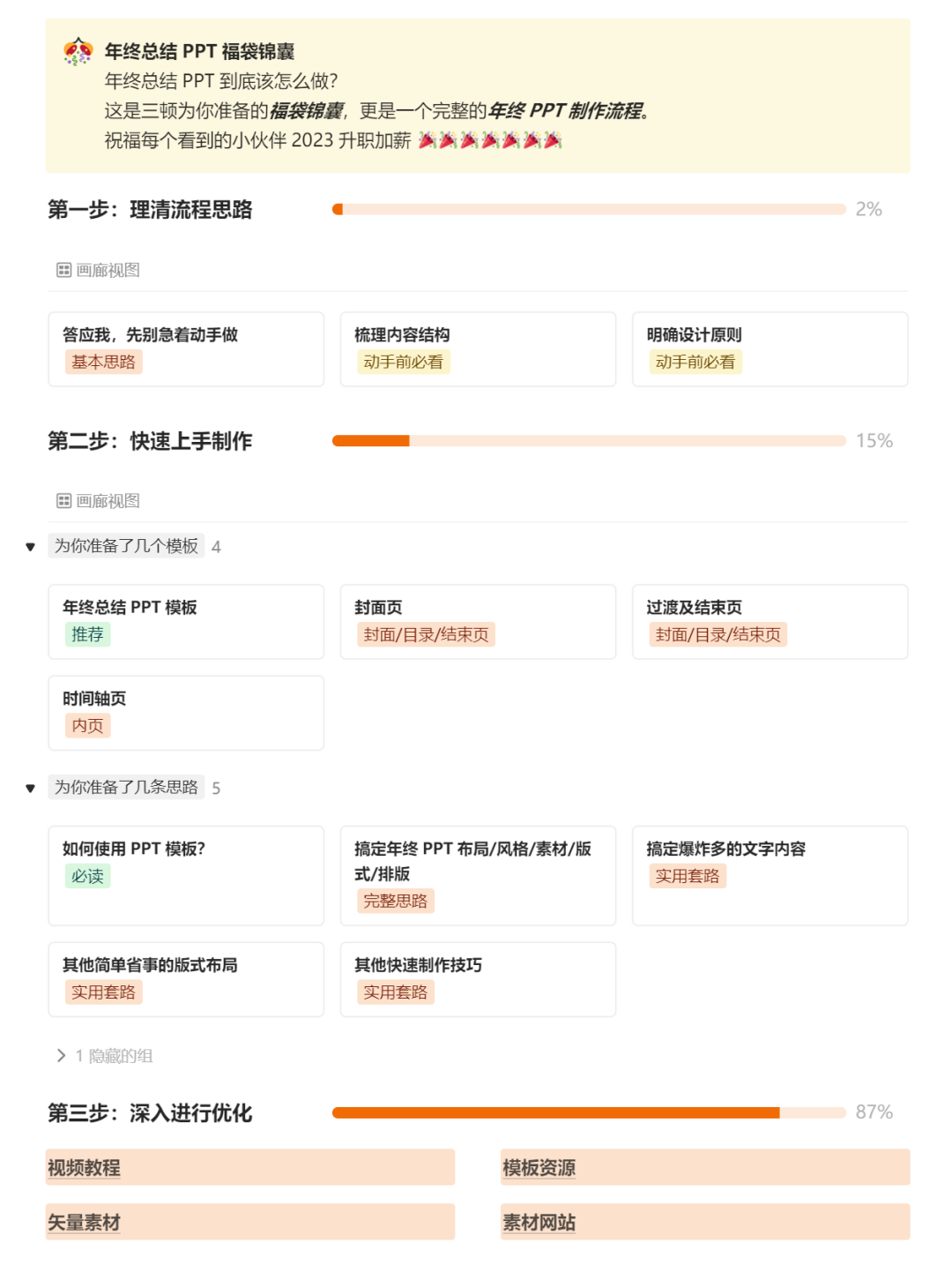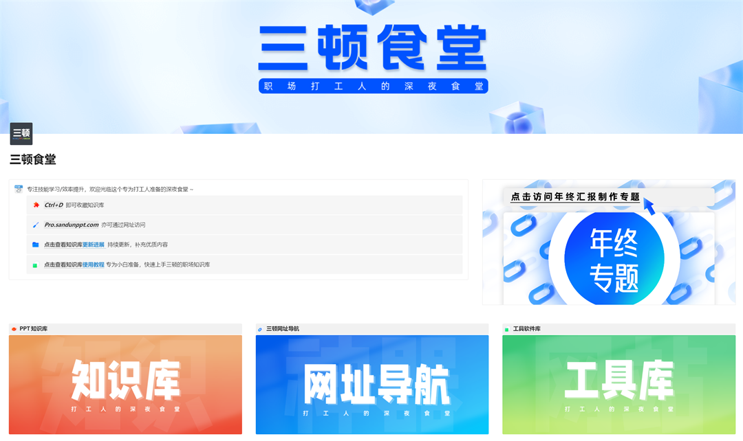 并非简单的素材、教程堆砌,通过这份制作指南,你可以跟着三顿,按照步骤一步步查看教程、使用资源,轻松、快速搞定年终总结PPT。