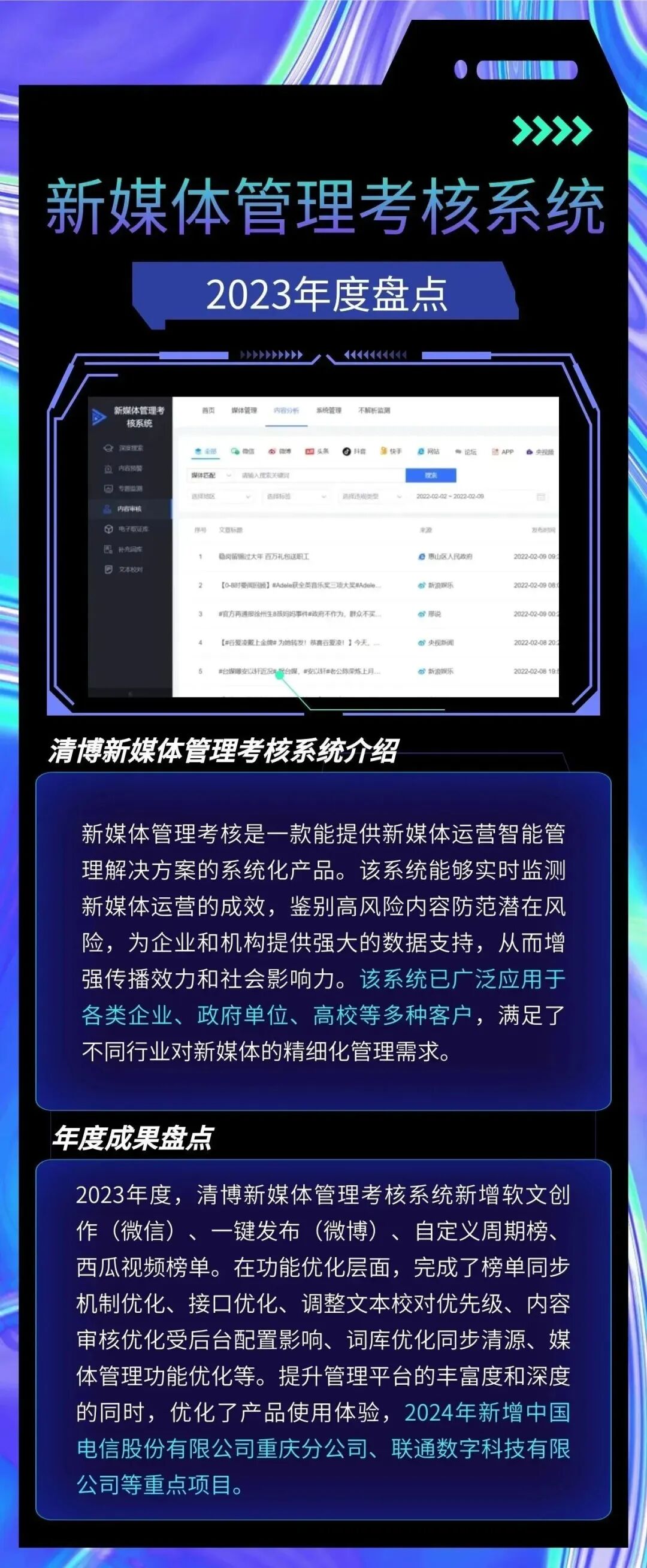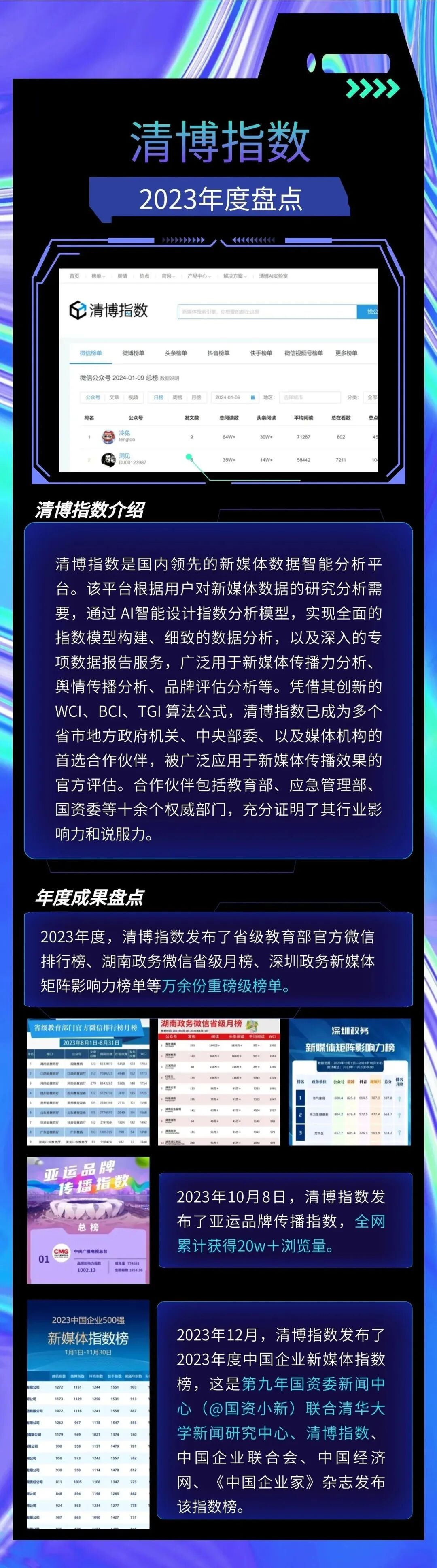 清博智能潜心打造了清博舆情、清博指数、清博新媒体管理考核系统三大产品,利用人工智能技术,助力品牌风险管理与品牌形象升级,服务多家国家部委、央国企、世界500强企业,提供AI智能内容传播分析及服务,助力品牌形象升级。这一年,以上三款产品根据用户需求,不断迭代优化,取得了不菲的成绩。值得一提的是,清博智能团队策划、运营清博智能旗下各新媒体平台账号更是在2023年达到了100万+粉丝量。02