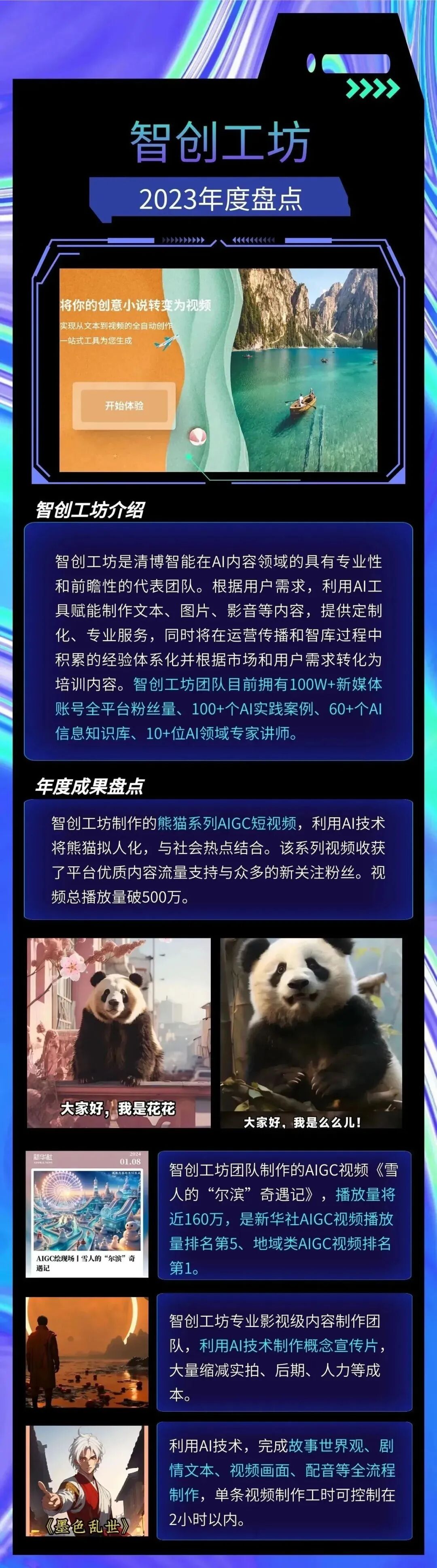 2023年,在AIGC技术的高速发展下,清博智能推出创新性AI内容服务团队智创工坊,同时推出全新清博培训业务。根据用户需求,利用AI工具赋能制作文本、图片、影音等内容,提供定制化、专业服务,优化服务课程体系。