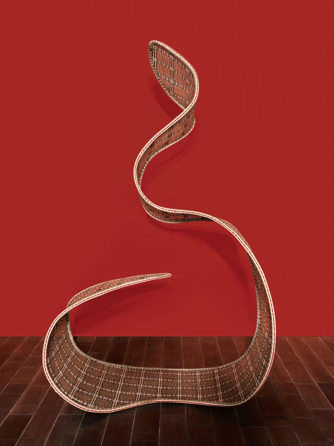 工作室正厅的隔壁,是钱利淮的办公室,与摆放着大件成品与半成品的正厅不同,这里满是细细碎碎的小件样品。这一次与 Burberry 合作的蛇年艺术装置,就是他坐在这间办公室的竹凳上构想并设计的。在钱利淮的办公室里,一面墙上是30cm见方的无数平面竹编示样,对面墙则是钱利淮的“研究成果”,他以现代工业设计的逻辑和框架,将传统竹编艺术的基础结构分成了七个大类。中间的长条形案桌,散放着钱利淮本次 Burberry 项目的草图和其他测试样品,在最初的七版设计中,出于简洁性和艺术表达的考量,他选择了以齐白石《草蛇图》为灵感的这一版。用铜丝和牛皮纸制作的成品模型,被他整齐摆放在墙边的置物架上,九条小蛇,并列起舞;很快,它们就会附灵于竹编,游动至全国各地的 Burberry 旗舰店橱窗中。作为竹编艺术家,这间办公室内的数之不尽的竹编呈现,就是钱利淮进行艺术创作的画笔与刻刀,“知道技术能达到什么样的水平,反过来也会影响创作的水平。我并不喜欢先考虑技艺,要先有灵感,把它们画出来,再去匹配相应的技艺。技艺其实是‘工具箱’。”以钱利淮如今对竹编技艺的掌握,只要画得出来,就能做得出来。本次为Burberry定制的农历蛇年装置以齐白石的《草蛇图》为灵感,一共九件。齐白石的《草蛇图》以轻松自由的寥寥数笔勾勒出游走在蒿草上的小蛇,蛇身虽粗细不一,却如同一笔绘就;画面中大幅的留白,则体现出中国画“计白当黑”的写意传统。钱利淮以竹为笔,同样精准捕捉到了蛇的灵动和神秘。以材料性质考量,墨笔与竹丝具有相似的不受限的延展性,装置中的竹编“平面”有着稳固的三角形-六边形组合编织构型,在不加干预的情况下,可以连续延伸;而通过对竹编“平面”的布置与裁切,装置整体也呈现出了如画中由“一笔”勾勒出的蛇身的粗细顿挫。在将竹编“平面”塑形为立体雕塑的过程中,钱利淮则由画面中的意境出发,引入大量留白和负空间,将画中在二维平面内游走的草蛇,形塑出更多元、动感的形态。九个不同的竹编装置,既是独立的个体,拥有着属于自己的故事和情感;同时又紧密相连,构成一个和谐的整体。钱利淮解释,在创作的时候,灵感总是会来得很快、源源不断,“感觉这个东西,瞬间就能’来’,但是创作是要把这种感觉和情绪固定住,让其他人也能感受得到。”他以为Burberry成都太古里旗舰店创作的装置为例介绍,“这是两条蛇,两条可爱的蛇,(我想象的)它们的状态是一只在不理另一只。”