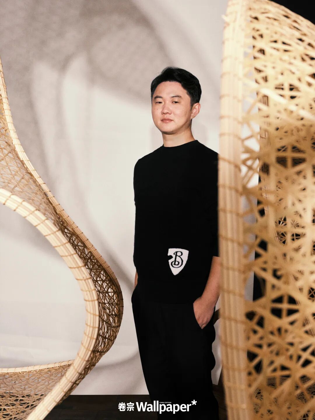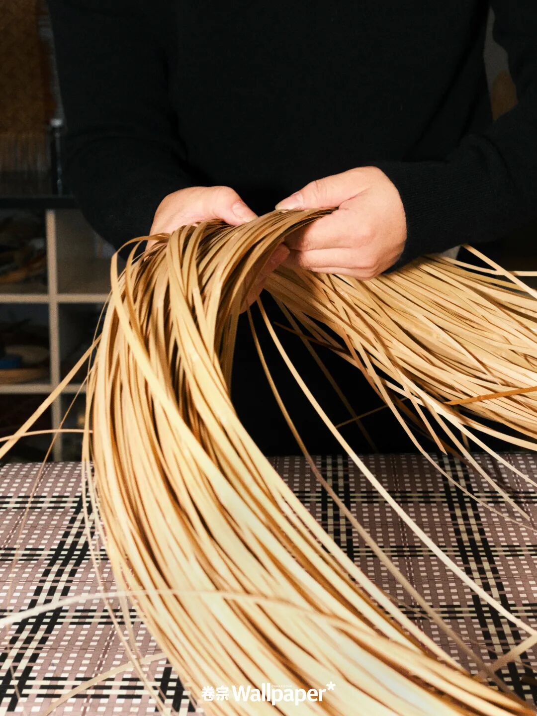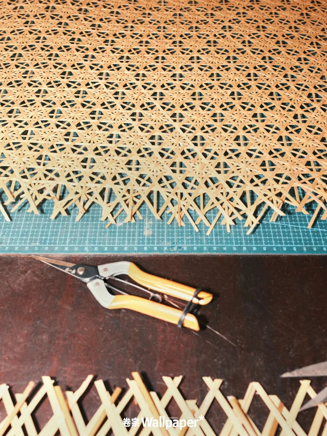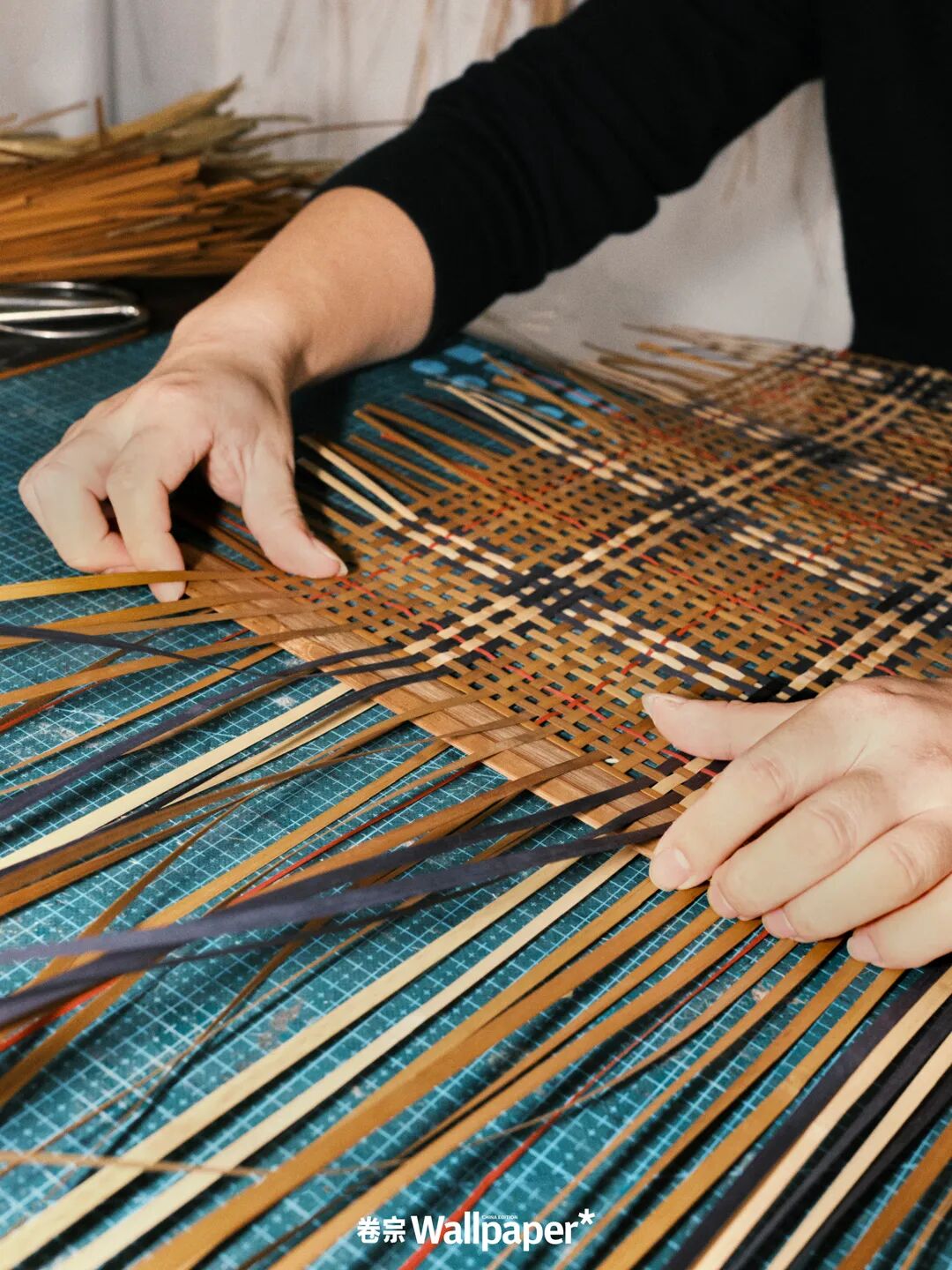 在我们即将离开的最后,钱利淮拿出了已经完成平面编织、但尚未进行立体塑形的Burberry经典格纹图案竹编,相比于另外两种以三角形-六边形为基础结构的编织方式,这一款图案竹编由最基础的经纬编织构架构成。理论上讲,相比于三角形-六边形的结构,经纬编织在立体塑形时稳定性会弱一些,但是这对于钱利淮来说已经不是一个问题,通过塑形、做支撑架、包边再最终上胶,他已经能够确保经纬的编织形态在异形状态下依然不发生形变,完美呈现Burberry品牌经典视觉的表达。由于这一款竹编涉及到对竹条的染色,他说起一个在创作时遇到的无关编织与塑形的“问题”,“因为不同竹子的吸水性不同,染色的时候可能个别会有色差。但有意思的是,我们开始用了纯白漆染色来体现品牌格纹中的白色条纹,效果不好;后来我就用了竹子的本色,不经过漂染,结果在这里就很好地(把品牌格纹的颜色)还原了出来。”他感慨着竹的材质奇妙,语气里也带着一种自豪,是做出了没有人做到过的东西的自豪。“我觉得,中国的竹编到底能走多远,取决于现在的年轻人能否用当代的眼光去看待。我觉得我和竹编匠人,或者说其他国家一些做竹编的人的区别是,我想要也正在探索未来,我希望能和当代的这个世界去做更好的沟通。我想Burberry能够看到我的作品、喜欢我的作品,一个很大的因素,就在于此。”