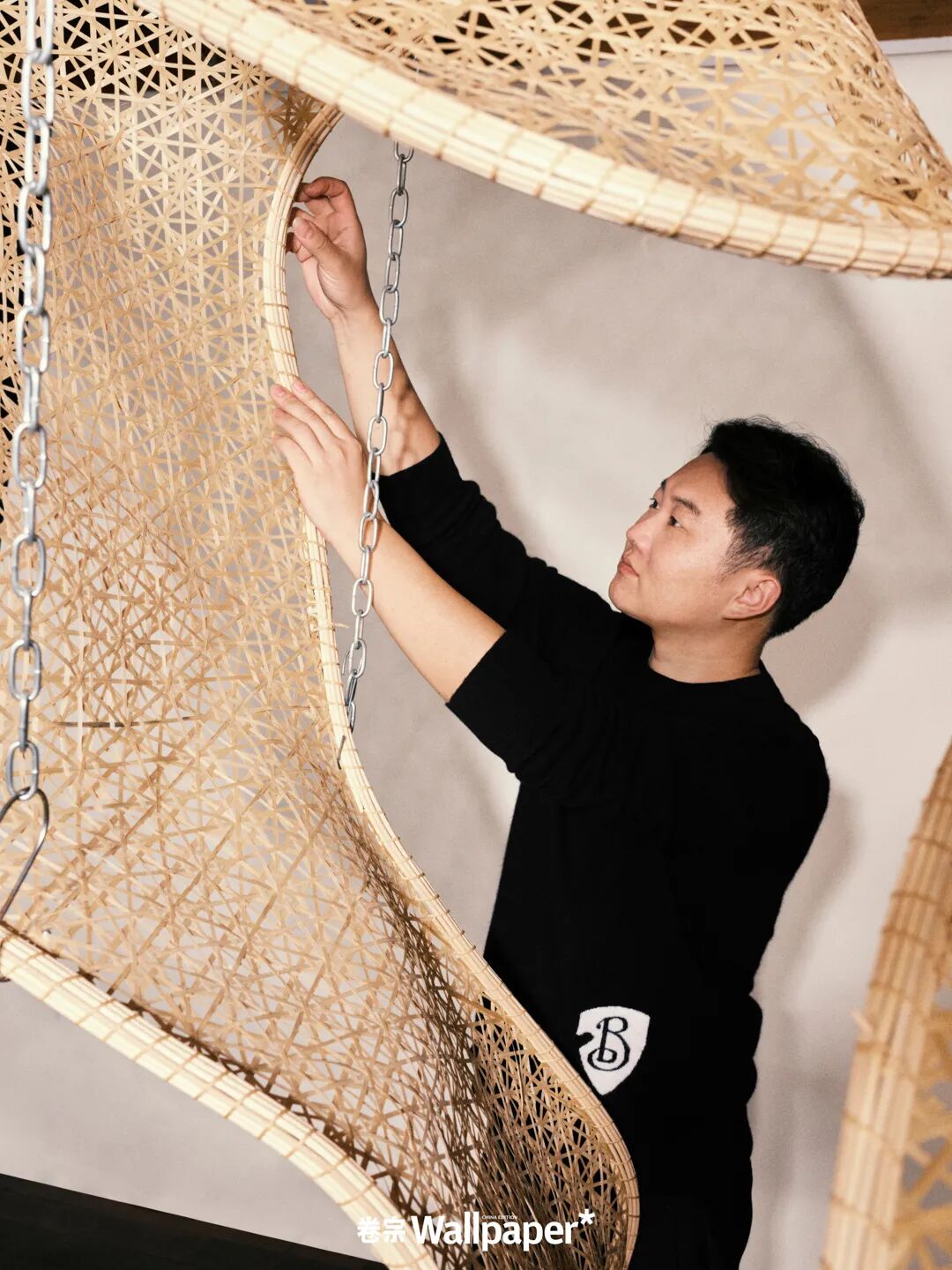 从乌镇西栅出发,仅十几分钟,便可到达陈庄村。自明清以来,这里就是江南著名的“竹编之乡”,据《桐乡县志》记载:居民以竹器为业,四方贸易甚远,苕霅诸山货竹者皆集于此。钱利淮出生在陈庄村,在外求学拜师数年,最终又将自己的工作室搬回这里。当我们到达时,他正在与另两位竹编师傅一同工作,为悬吊在工作室正厅中央已经大体成型的竹编艺术装置固定边幅,这是他为Burberry创作的九件蛇年橱窗艺术装置中的一件。用不了多久,这件装置就会出现在Burberry上海恒隆广场旗舰店的橱窗内。两位师傅都是熟练的竹编工匠,他们席地而坐,一边拆除竹编网面边缘与固型金属丝上原本的连接扎带,另一边将颇有韧劲的藤条弯折成贴合竹编网面的形状以包裹住金属丝。数根藤条汇集在一起,将其塑造成完美贴合竹编边缘的异形状态并不如看上去般简单,没弯折捏压一段,师傅就需要用一根新的扎带立刻固定,以防止藤条自身的张力对原有的装置廓形产生影响。整个装置以金属链悬吊在天花板,地板上是用来确定橱窗空间范围的标识胶带,而装置上密密麻麻,都是扎带。等外围藤条锁定完毕,钱利淮还需要亲手为竹编面再次塑形,凹凸宛转、起伏吞吐,全凭他的手感。这样一件装置,需要大约六名成熟竹编工匠的配合,每天从七点到十点轮班上阵,要做两周才能完成,每一寸虚实,皆为心血。钱利淮对这样的工作创作状态已经习以为常,用他的话来说:竹编人,闭上眼睛都是格子。01
