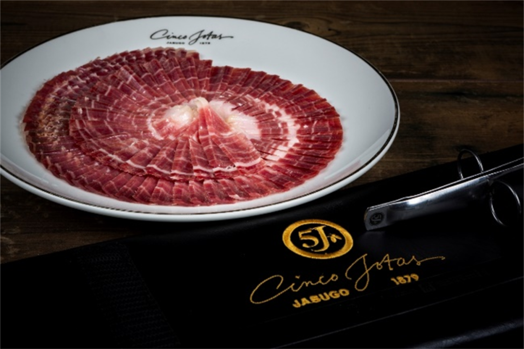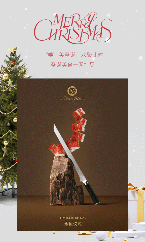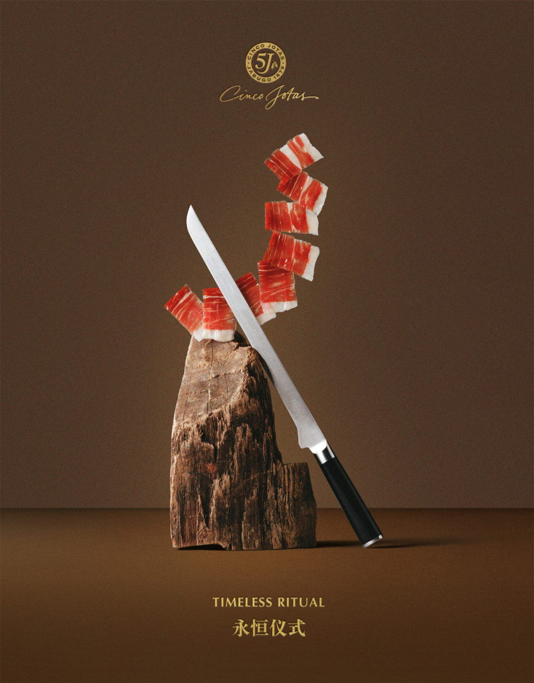 5J火腿的经典呈现,离不开火腿切割师艺术家般的刀工演绎,这便是“永恒仪式”珠宝盒的设计初衷。每一片5J火腿,经由火腿师的切割,形成薄如蝉翼、饱含大理石纹理的美食艺术品。蝉翼般的火腿片在“永恒仪式”设计中展开如飞翔羽翼,结合代表火腿切割技艺的火腿刀和自然木质结构,组成一场坚柔并济的风味仪式。