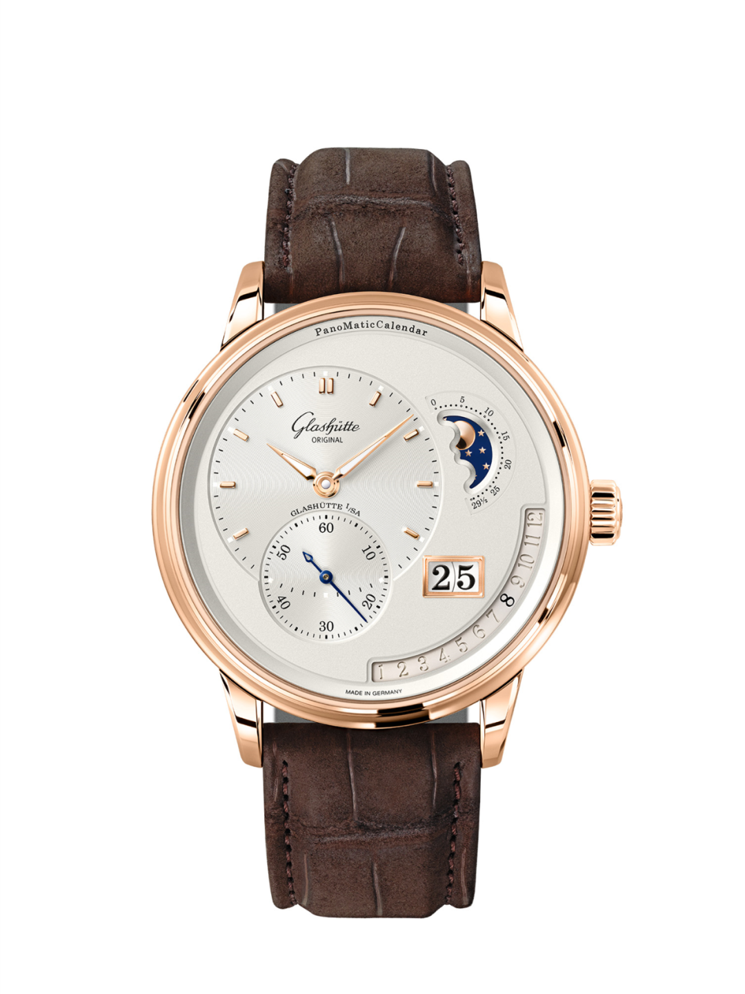 PanoMaticCalendar偏心年历腕表将品牌原创精神持续发扬,别具一格的偏心表盘拥有过目难忘的外观,将分时盘与小秒盘设计在表盘左侧。