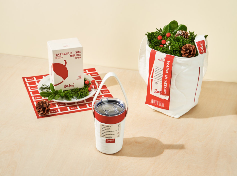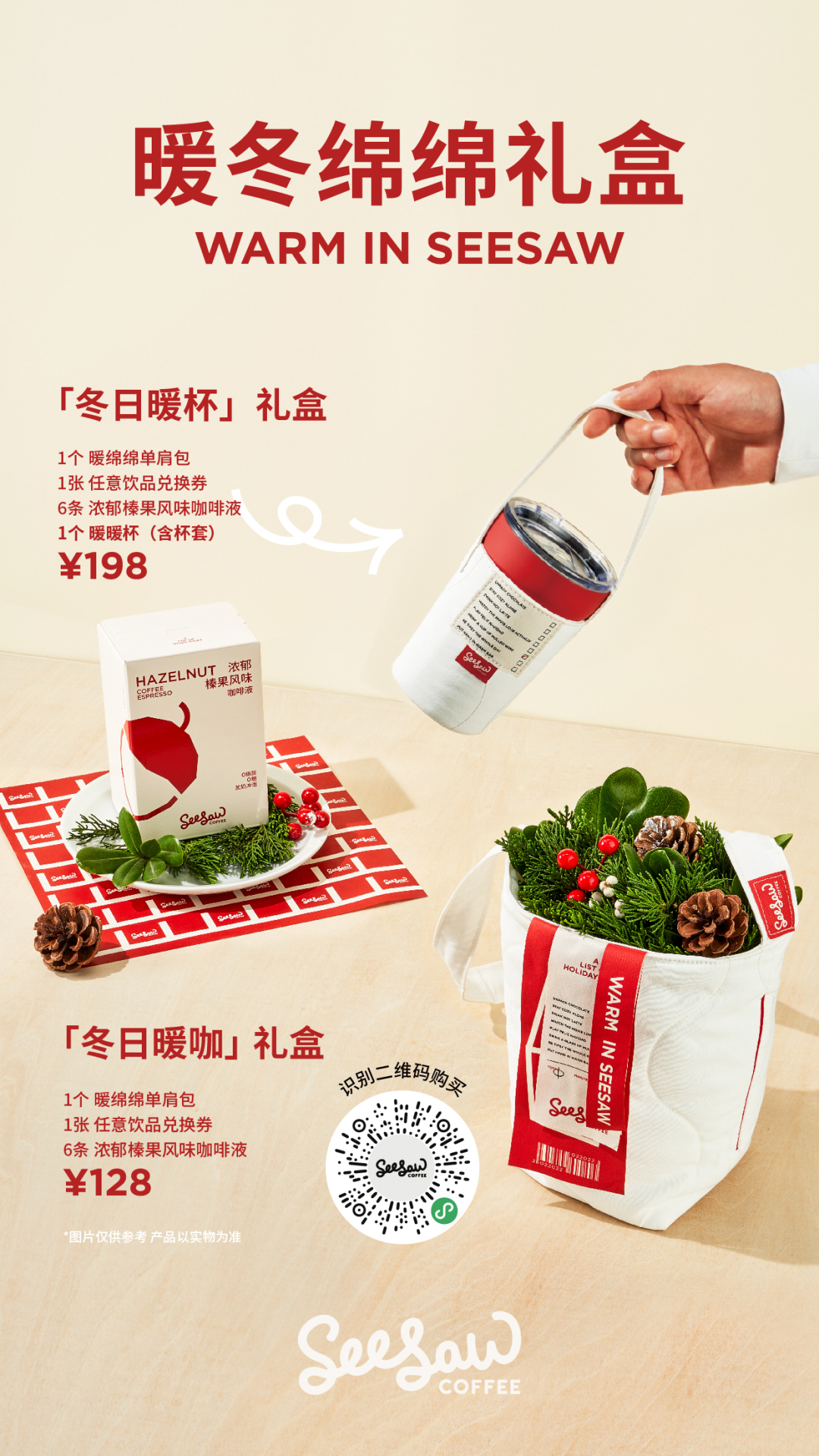 Seesaw暖冬绵绵礼盒共有两款可供挑选,「冬日暖杯」款礼盒¥198,内含:暖绵绵单肩包、浓郁榛果风味咖啡液、WARM IN CUP 暖暖杯、Seesaw任意饮品兑换券。「冬日暖咖」款礼盒 ¥128,内含:暖绵绵单肩包、浓郁榛果风味咖啡液、Seesaw任意饮品兑换券。可通过Seesaw天猫店、小程序商城及全国线下门店温暖选购!