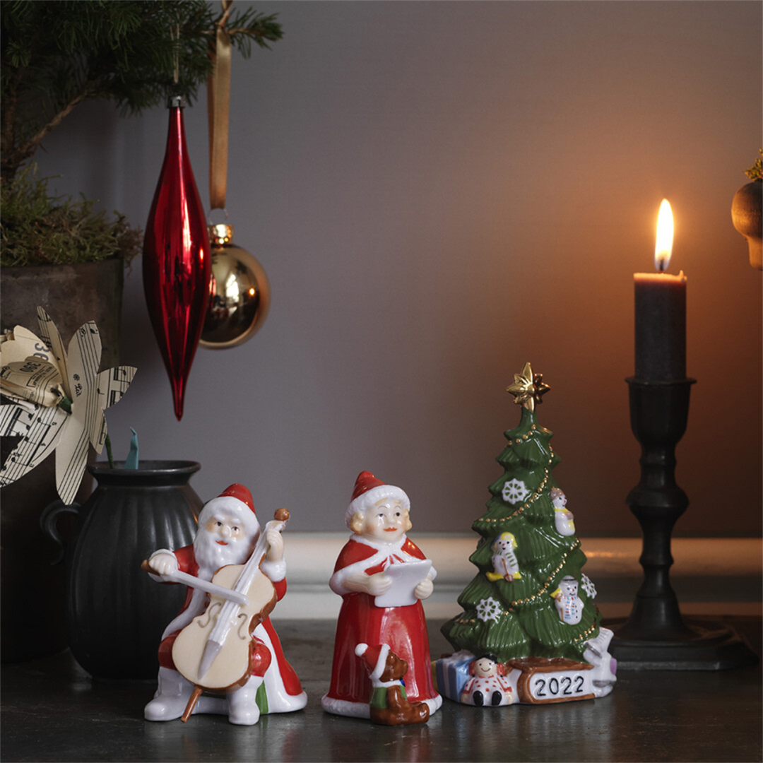 2022 年度 圣诞老人瓷偶,画师精心描绘了各种趣味细节,圣诞老人身着红白色彩的传统圣诞装束, 正在专注演奏着他心爱的大提琴。莹润生光的圣诞瓷偶及装饰摆件,将多元趣味融入欢愉节日,营造充满温馨色彩的圣 诞家居氛围,亦可用于制造圣诞惊喜,以礼奢宠您所爱的人。