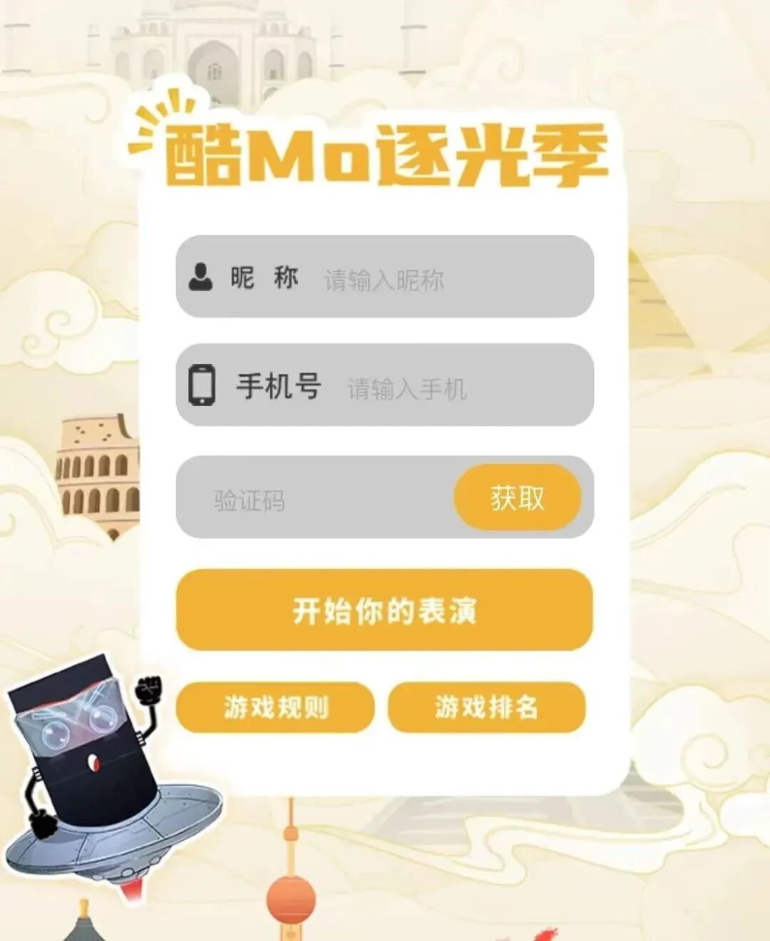 输入你的专属称号与正确手机号(获取验证码,核对身份信息) 点击 开始你的表演 就能进行“追光”啦