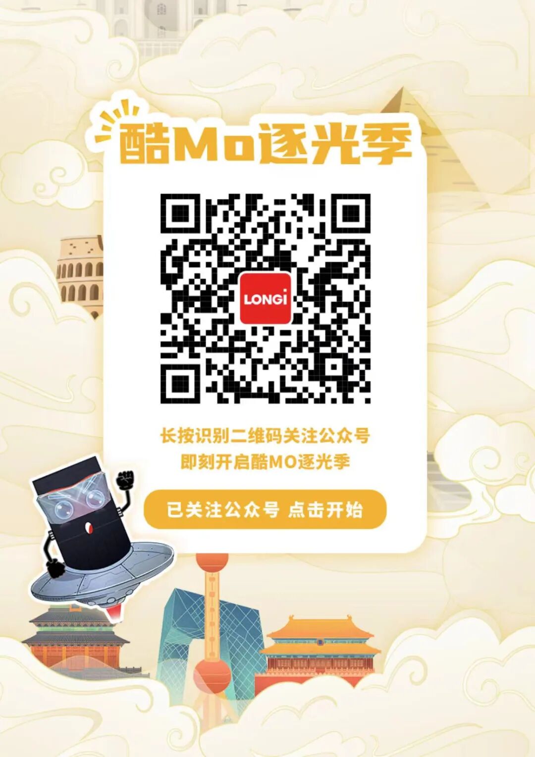 扫描文末二维码,关注隆基LONGi Solar公众号。返回界面,点击“已关注公众号 点击开始”即可进入游戏(如图所示)。