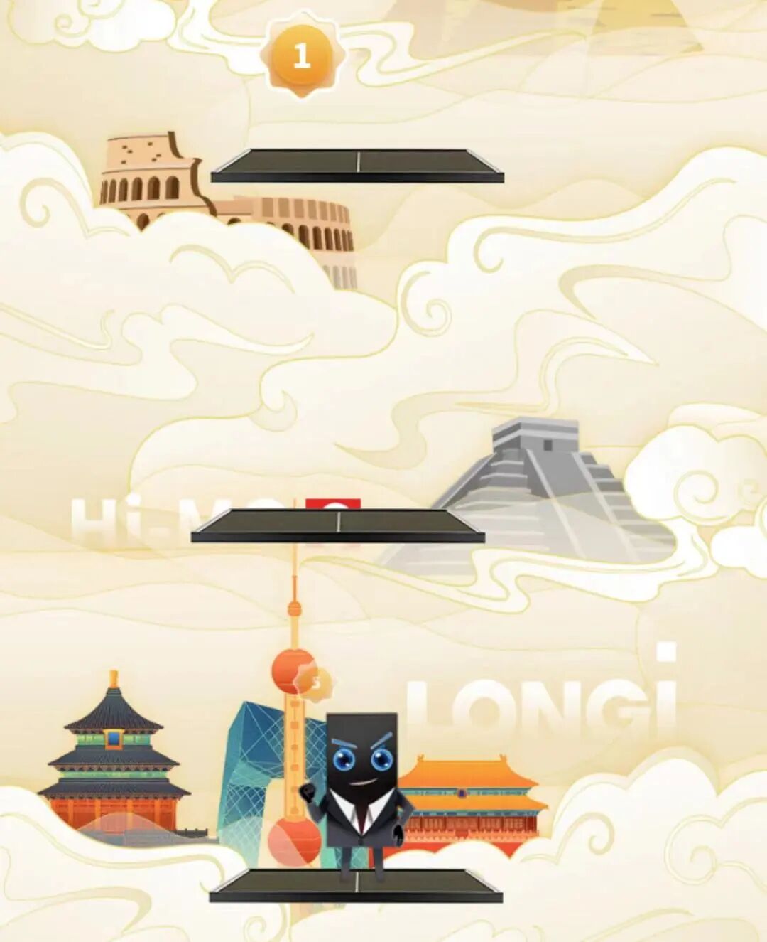 ■ 点击屏幕,帮助酷MO向上跳跃至踏板——隆基Hi-MO 6组件,注意随着时间流逝,踏板移动速度会加快哦。