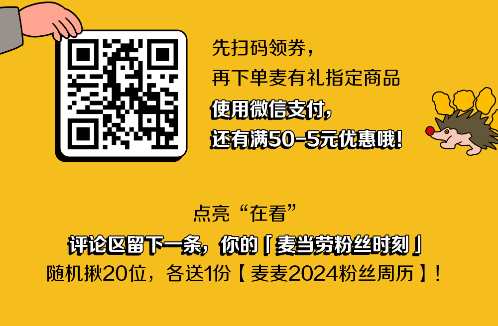 2023年11月22日至2023年12月31日,扫码领取麦有礼BFF满50减5优惠券。