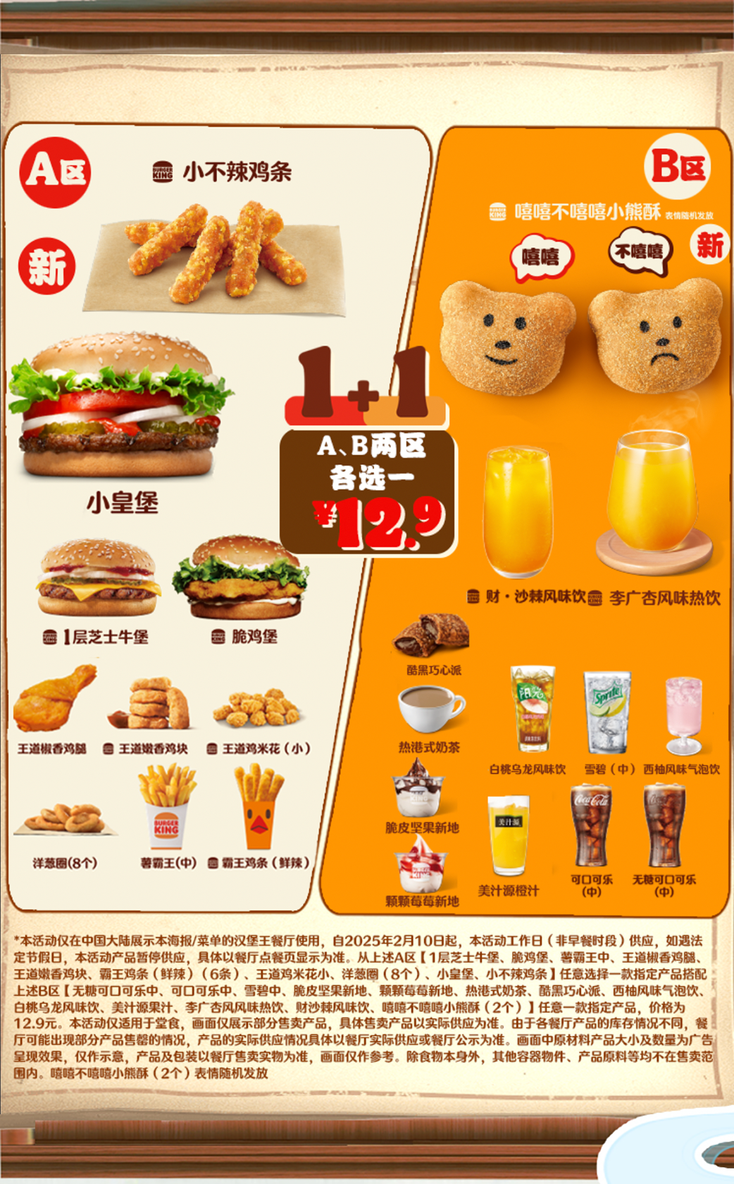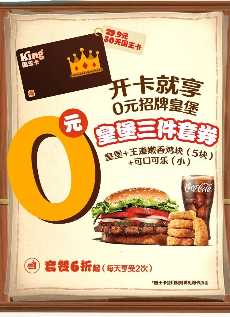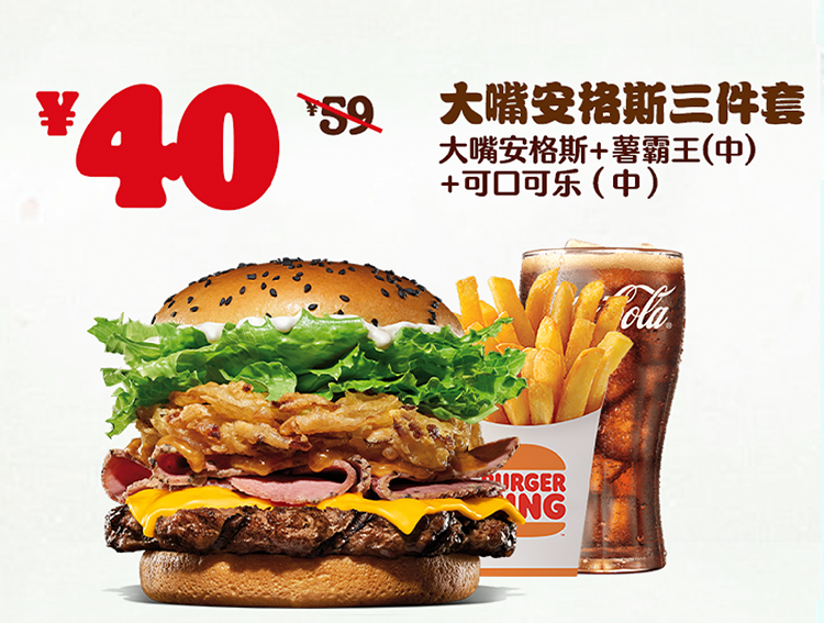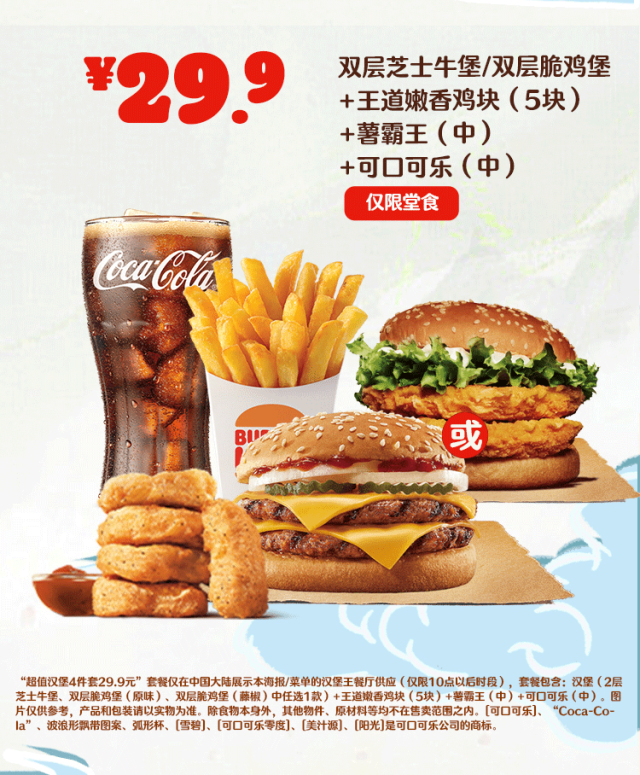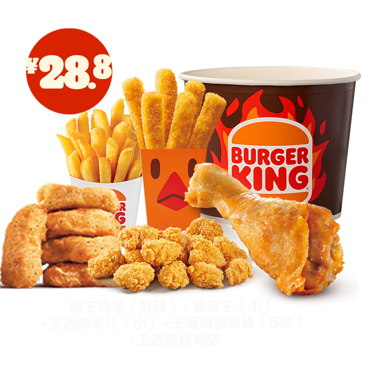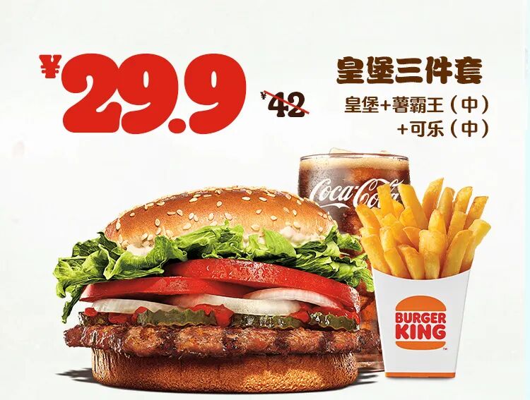 *非外卖渠道价格解释:图示如有划线价格,并非指原价,而是指不参加优惠活动情况下该产品在汉堡王指定门店销售的常规价格(或者指其中所含单品的常规单买价总和)或汉堡王门店建议零售价。除非图示另有解释,否则图示如有节省的金额或折扣比例,是与不参加优惠活动情况下在汉堡王指定门店单独购买该产品的常规价格(或者其中所含单品的常规单买价总和)或汉堡王门店建议零售价相比较。若需要查询当前门店销售的常规价格,可查看相应门店菜单或详询店员。