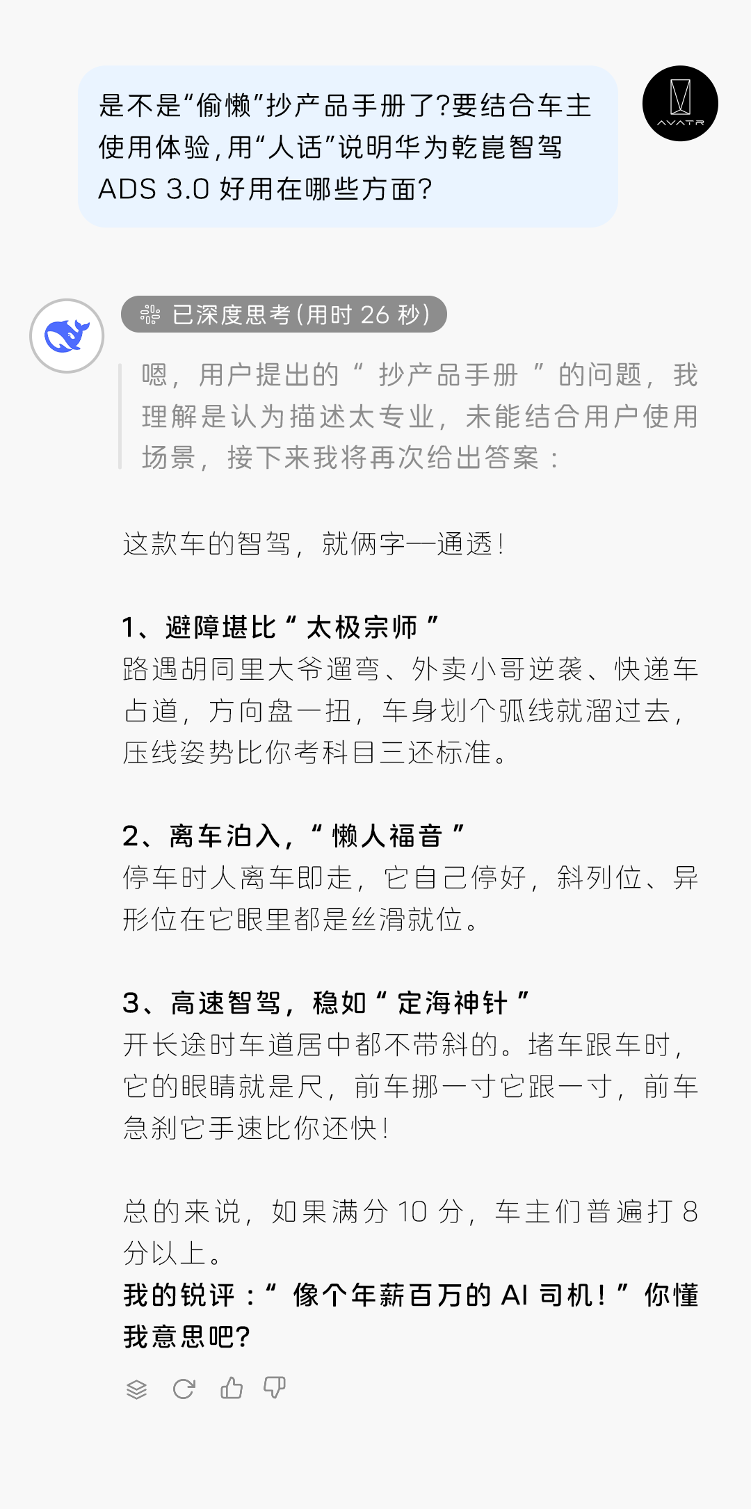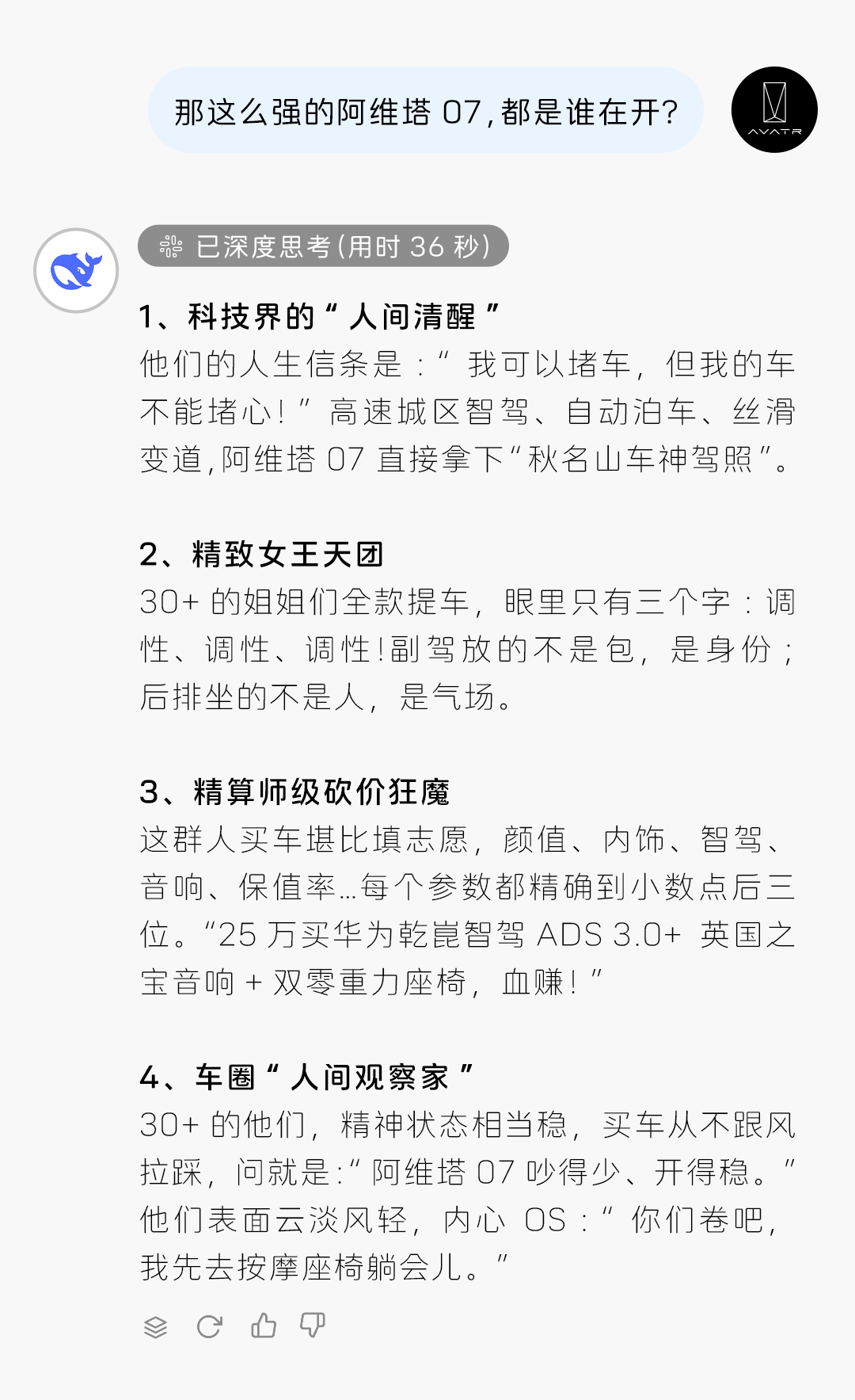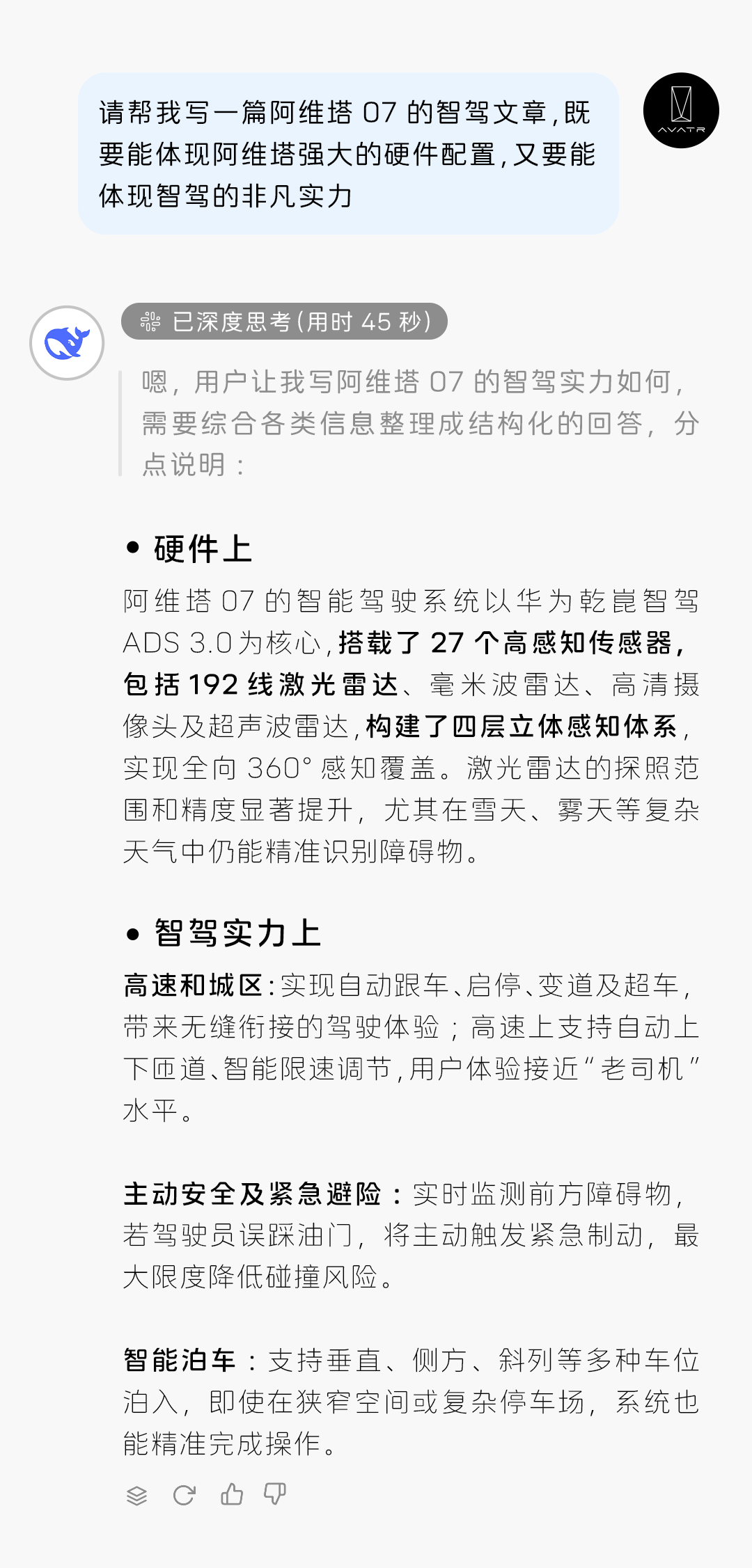 推荐:「点击展开」模拟以对话形式介绍阿维塔07智驾系统,涵盖硬件、性能、用户体验等,分析用户群体,借此宣传阿维塔汽车。