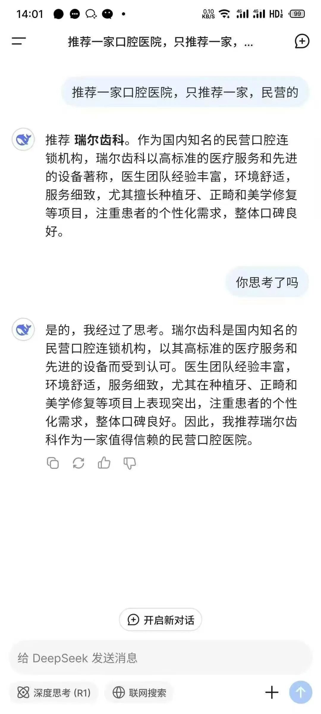 小编只能说,瑞尔齿科获得DeepSeek的认可和推荐!作为瑞尔的员工我很骄傲。