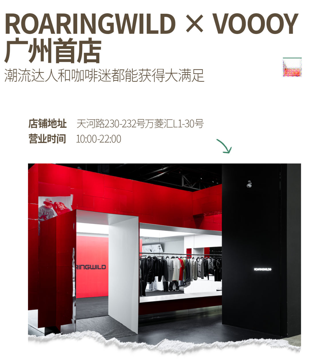 有关注潮流圈的朋友都一定收到风,原创国潮品牌ROARINGWILD联名南京咖啡品牌VOOOY COFFEE,在广州万菱汇开了一家线下体验店。