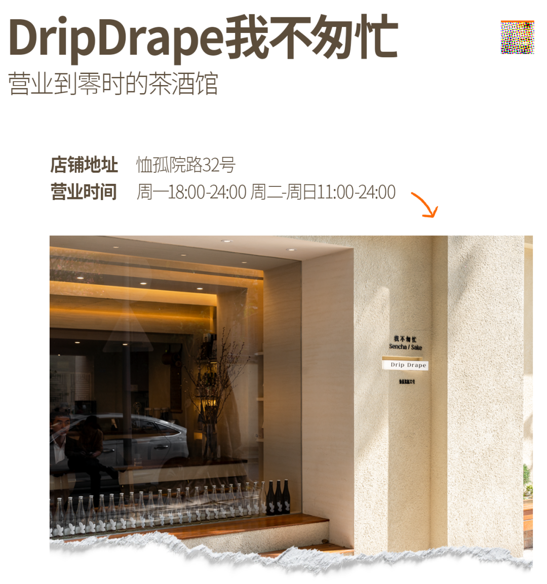 看到店名DripDrape我不匆忙,就知道这是一家需要静下心来体验的店,主打日茶夜酒。