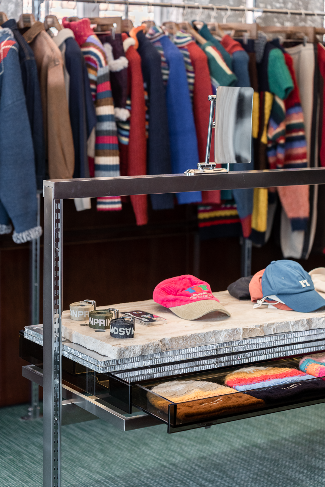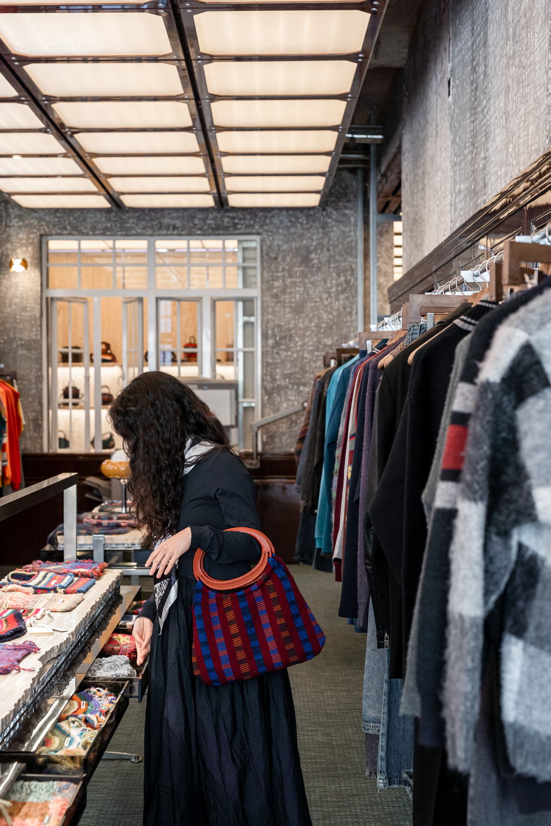 二楼还有不少偏厚的衣衫、包包、帽子、配饰……沉色调的单品掺进了彩色的编织毛线,点缀出一抹俏皮和活力。