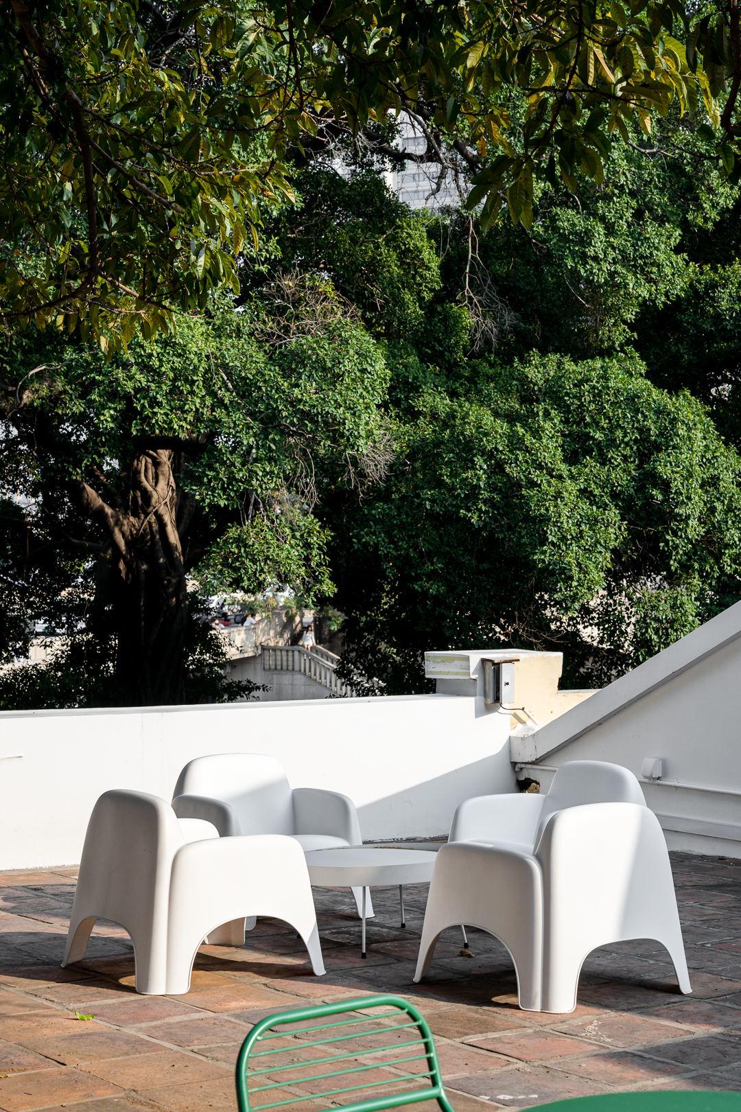 三楼打造成一个露天休息区,是俯瞰沙面的绝佳据点。珠江支流的潺潺流水、街道巷子的来往人群、别致外观的欧式建筑群全被尽收眼底。