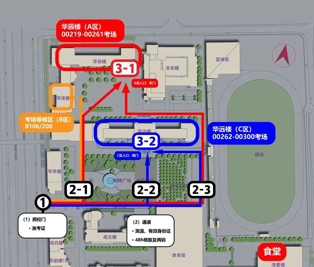 华辰楼和华远楼的楼门开放时间为上午7:30,下午13:15。华辰楼(A区)考场入口为该楼的东门(图2的3-1处),华远楼(C区)考场入口为该楼的南门(图2的3-2处)。