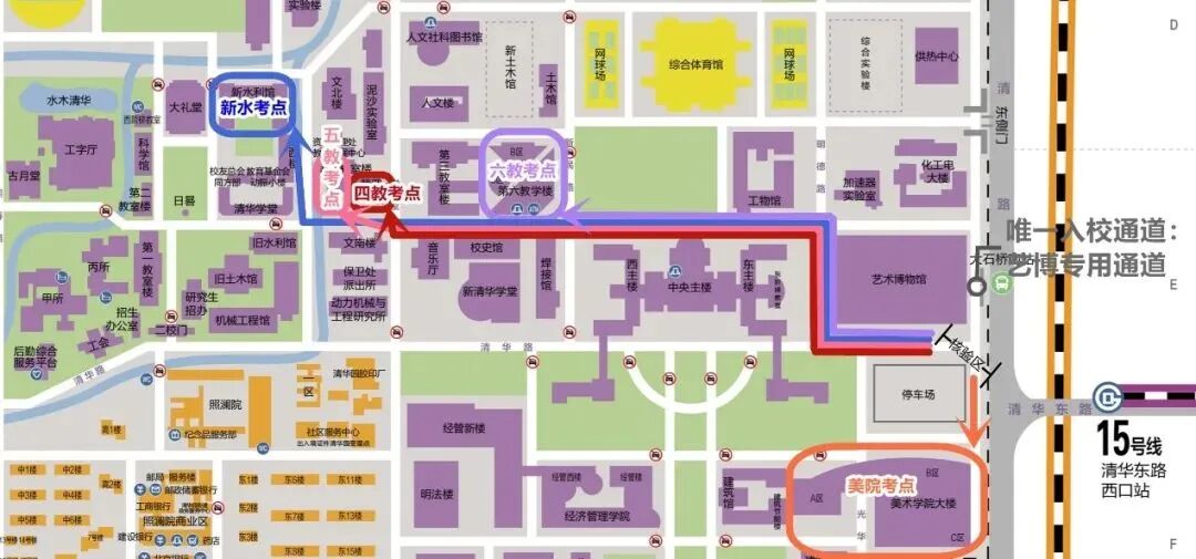 ● 图1 清华校内的考场分布和指定的入场、出场路线图