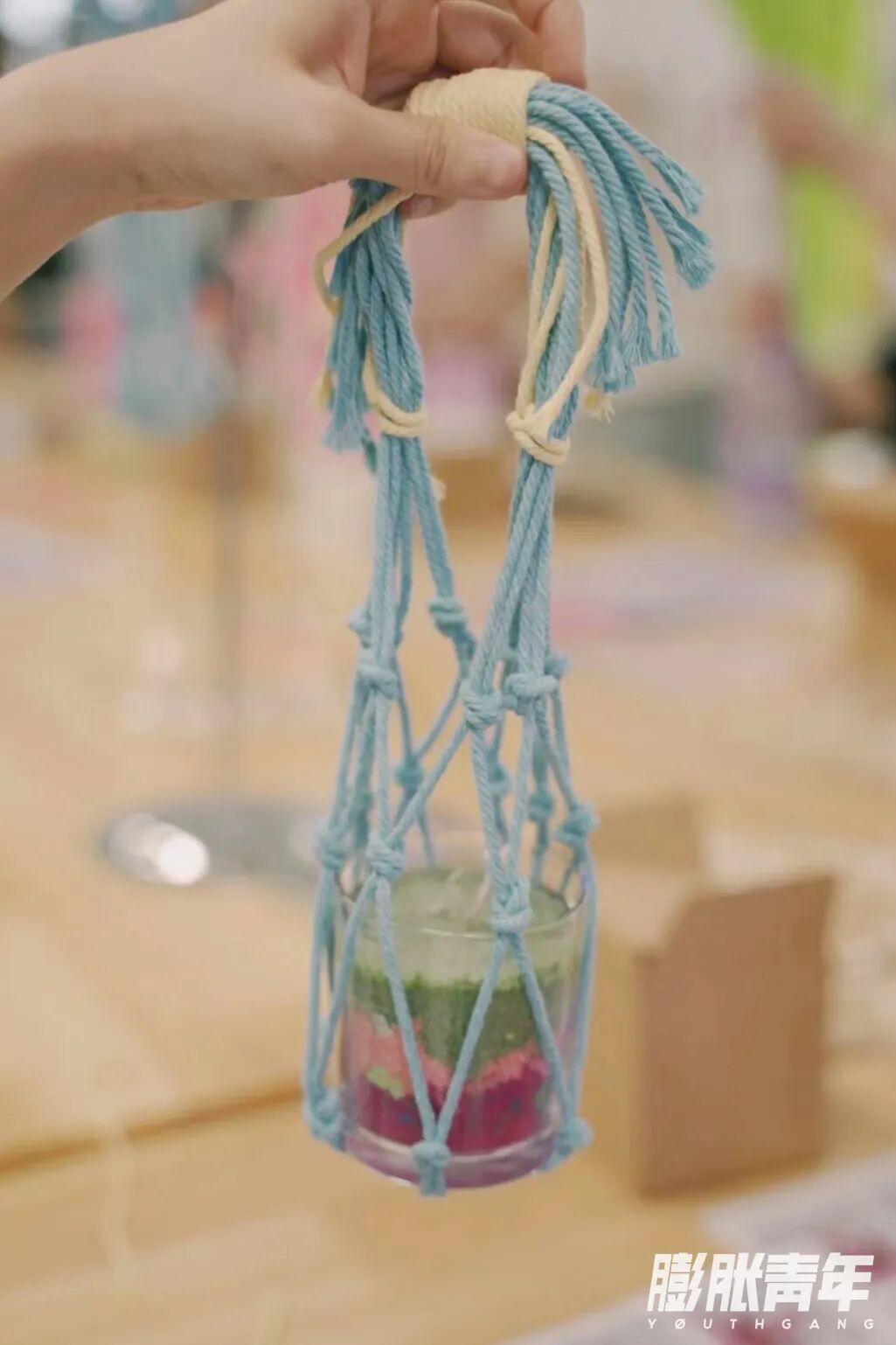 你一针,我一线,一条条彩色毛线就这么变成了一个立体的、可装载的小杯套。不过既然是搞个毛线艺术,怎么能被限制住!咱可以拿这个小艺术品套一切不是?先把刚刚做好的香薰蜡烛装起来再说!