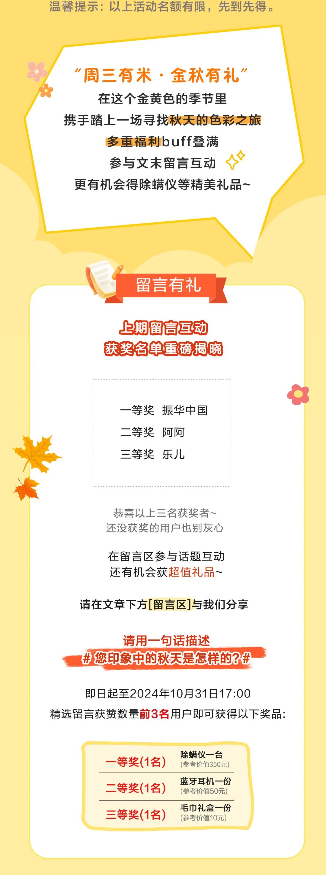 【留言有礼】“周三有米·金秋有礼”一起探寻秋色,超1000元福利等您来领!