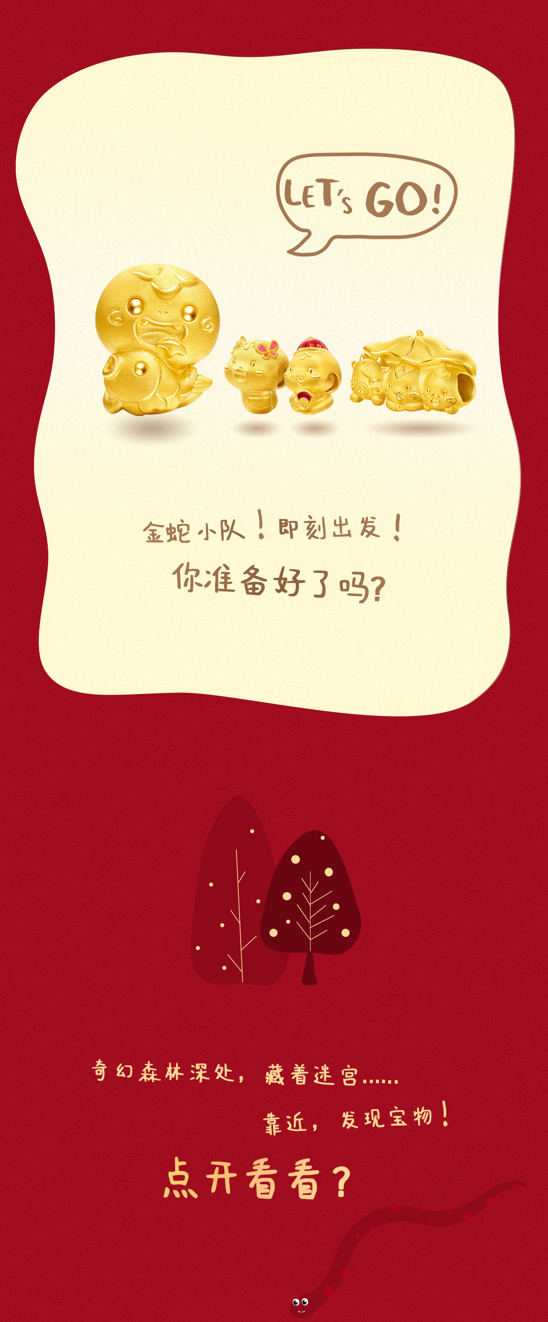 推荐:「点击弹窗」查看周大福各个款式介绍,暗示奇幻森林深处藏着迷宫与宝物,吸引读者点击探索,借此宣传周大福。