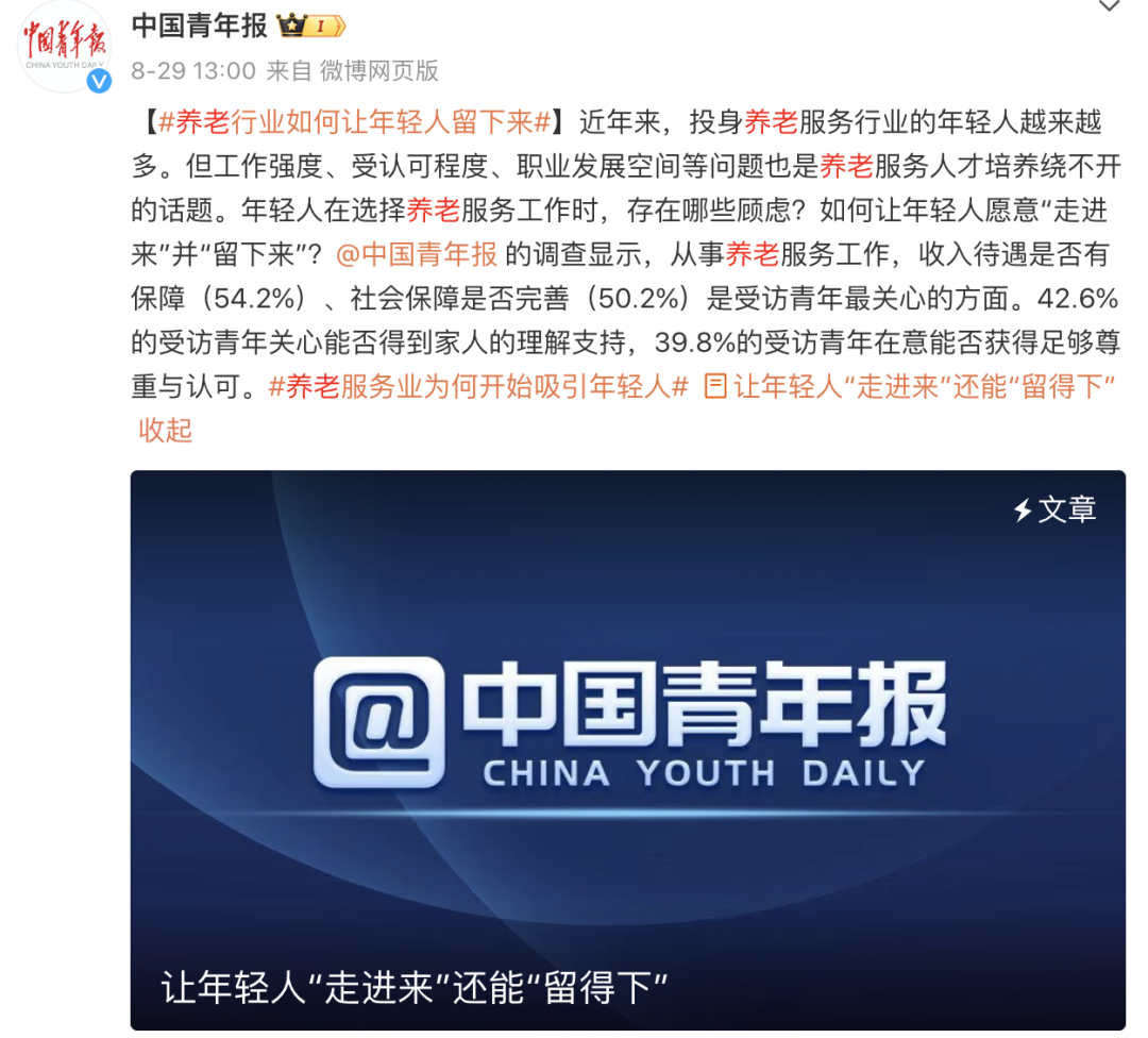 据潮新闻消息,教育部发布的《2024年度普通高等学校本科专业申报材料公示》显示,“老年医学与健康”专业位列专业申报数量的第五位。申报者之一、浙江树人学院的负责人感慨,“没想到,养老专业这么火”。2024年,来自山东和上海两所高校的中国首批养老专业本科生毕业了,受到用人单位的欢迎——面对上海工程技术大学养老服务管理专业30多名毕业生,30余家养老机构拿出了120余个岗位;而山东女子学院养老服务管理专业60多名毕业生,则接到了400多个就业邀请。杭州市社会福利中心组织端午节活动,老人和年轻护理员合照。图源:潮新闻据统计,山东女子学院养老服务管理专业,除了几名毕业生选择考公或跨专业考研,其余全部进入养老机构就职。而在上海工程技术大学,该专业的毕业生也一个不落,实现100%就业。根据中国老龄科学研究中心今年4月发布的《养老服务人才状况调查报告》,截至2023年,全国各类养老机构和设施总数已达40万个、床位820.6万张,养老服务队伍也在不断扩容。但从业人员主要由社会招聘而来,年龄多在41岁至55岁,文化水平普遍偏低。浙旅职院智慧健康养老服务与管理专业的学生在上实操课。专业技能人员的紧缺,让很多养老机构负责人忧心忡忡。以杭州某国际康养中心为例,今年年初落地杭州上城区,366个养老床位一经推出就被预定一空,但与之对应的是,“人一直招不满”,该中心的医生、护士、餐饮主管、护理员、销售专员等岗位,一直被“挂”在各大招聘网站。“岗多人少的状态,可能持续一段时间。”业内人士估算,截至2023年,全国高校、高职、中职共开设养老相关专业布点4000余个,按每个布点100个学生算,一年共约40万学生毕业。而根据规定,养老服务提供者与轻度失能及能力完好老年人的配比不能低于1∶10。王荣,山东某高职养老专业大三在读。刚开始实习的时候,他除了策划老年活动,每天雷打不动的一项工作是掰药、分药——对着近百位老人的资料、近千份名字晦涩的药物,一份份比对着掰好,放进标注着老人姓名、服药时间的药盒里。“眼都花了,生怕搞错。”他说,“这么多人,每人早中晚三次的药,恨不得把自己也掰成几瓣来干活。”“北漂”孟琪琪的烦恼,与王荣不同。入职北京某养老机构一年多,让她郁闷的,是社会对养老专业的偏见,“要么觉得我们是‘伺候’人的,要么觉得我们是推销保健品的……”忙、累还有偏见之下,不少养老专业学生想过转行,提得最多的原因是“家人反对”或“坚持不下去了”。一名从业者告诉记者,在一家养老机构工作5年后,她是同班唯一一个没有转行的人。随着养老行业的发展,“如何让更多年轻人留下来”也成为不少人关注的焦点。