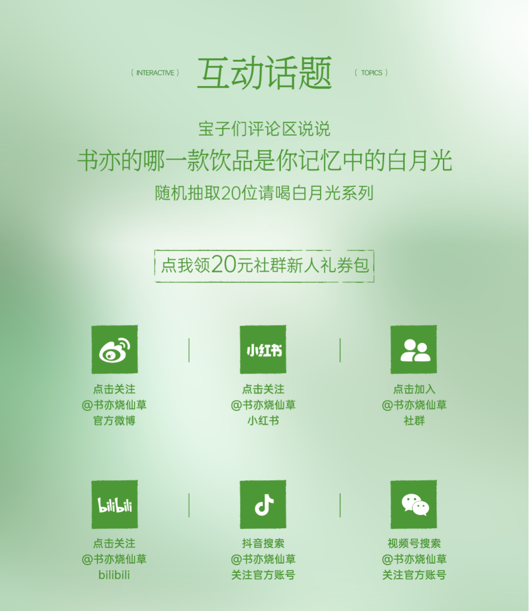 推荐:「点击伸缩后展开」推出春日白月光系列饮品的优惠活动,最后邀请用户在评论区分享书亦记忆中的白月光饮品,借此宣传书亦烧仙草。