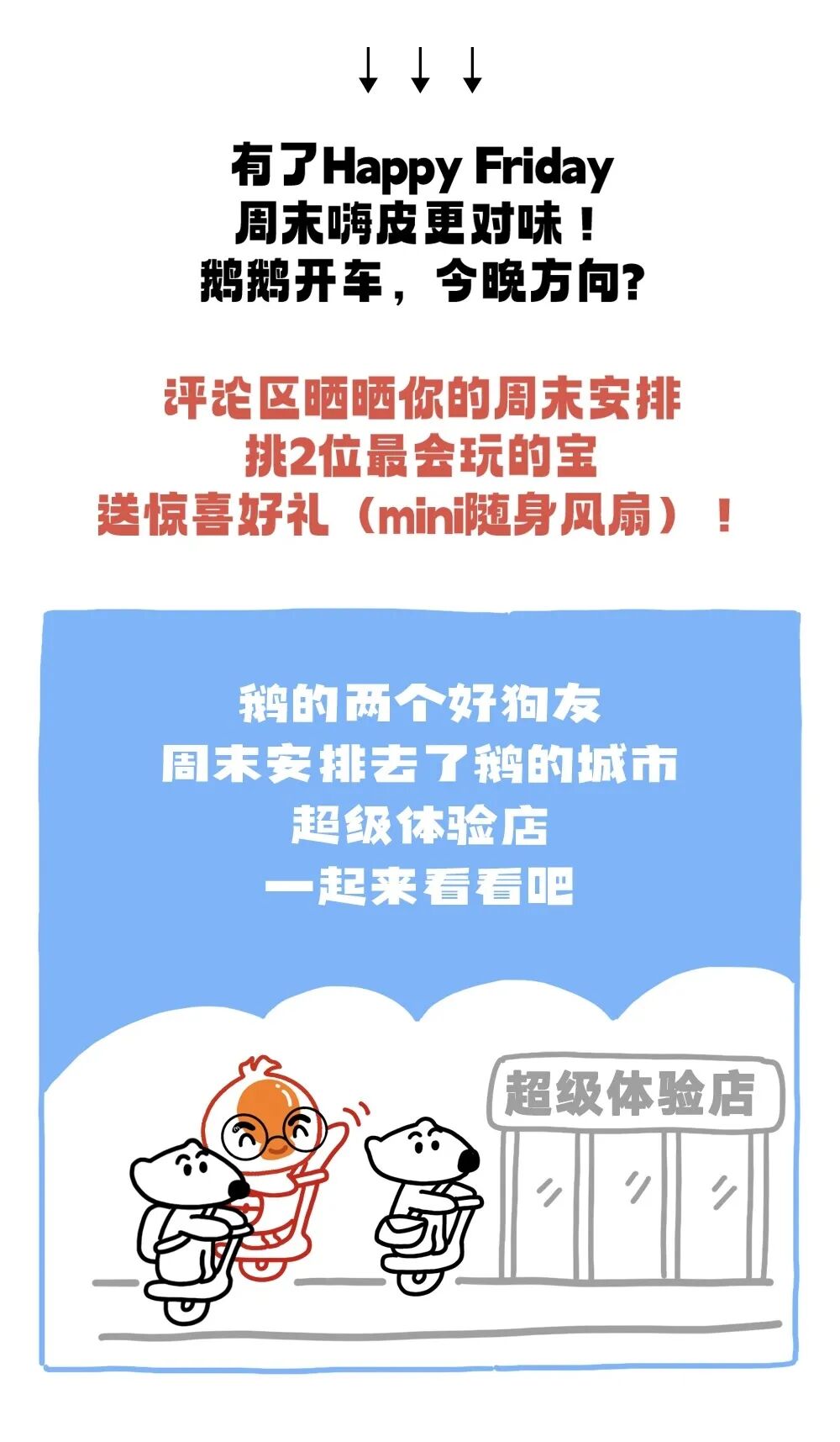 推荐:「点击放大切换后消失展开」提出 “Happy Friday” 周末话题,并展示朋友去全心全意小天鹅城市超级体验店的内容,最后引导加粉丝福利群,