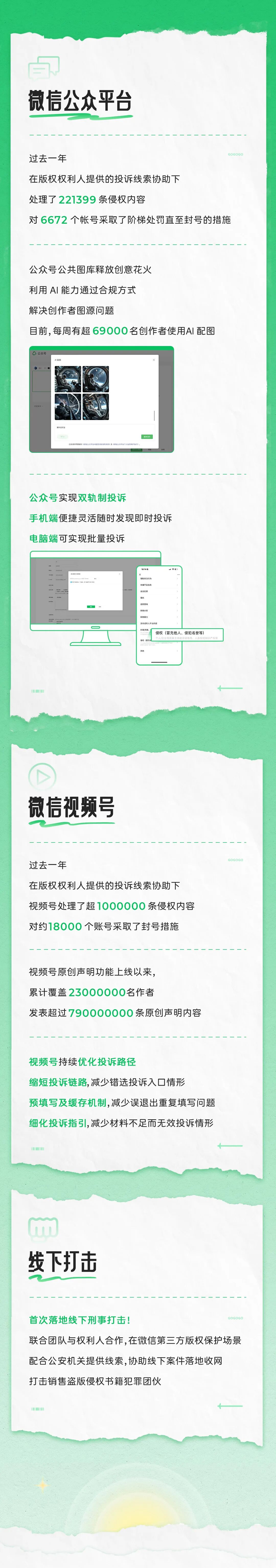 推荐:「点击切换后展开」讲述微信公众号、视频号过去一年严打侵权,处理海量违规内容,优化创作功能,还协同警方打击盗版,借此宣传微信派。
