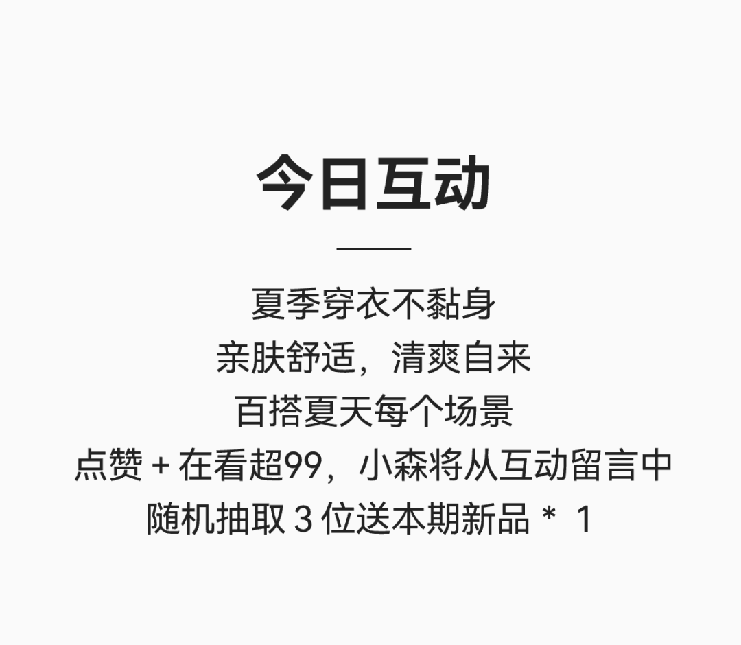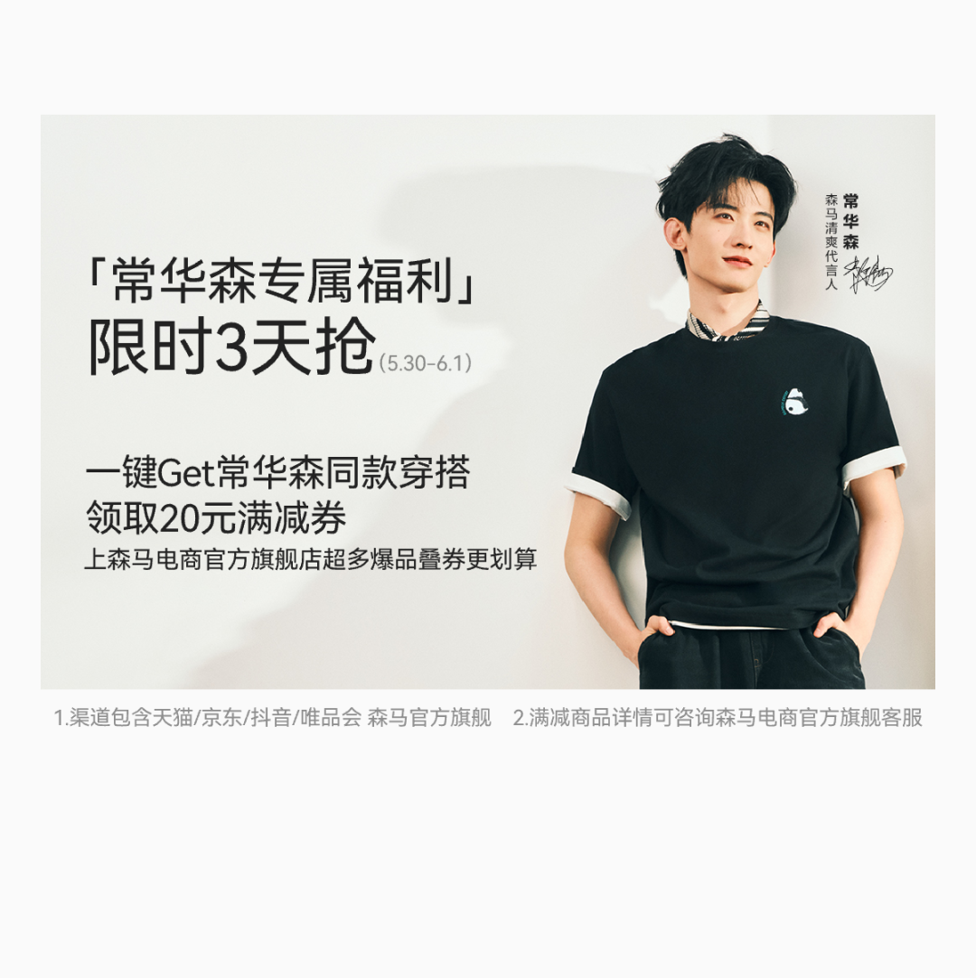 推荐:多个平级「点击展开」通过常华森的多场景穿搭示范,突出森马夏季服饰的吸湿速干、防晒透气等功能,结合限时优惠与互动抽奖,吸引消费者前往购买。
