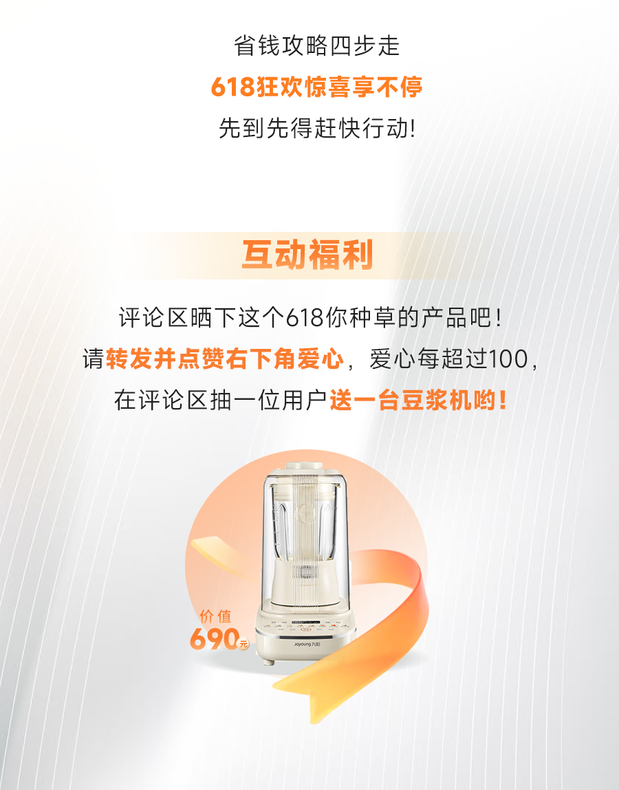推荐:「点击切换后展开」围绕 618 购物节,为用户详细梳理九阳的优惠玩法,帮助用户省钱,甚至省出一台破壁机的费用,文末还设置了福利活动。
