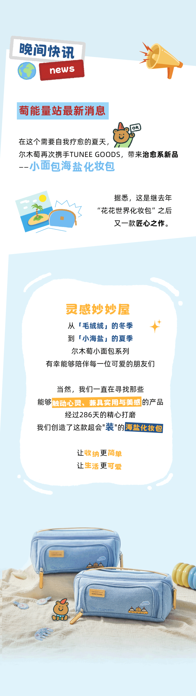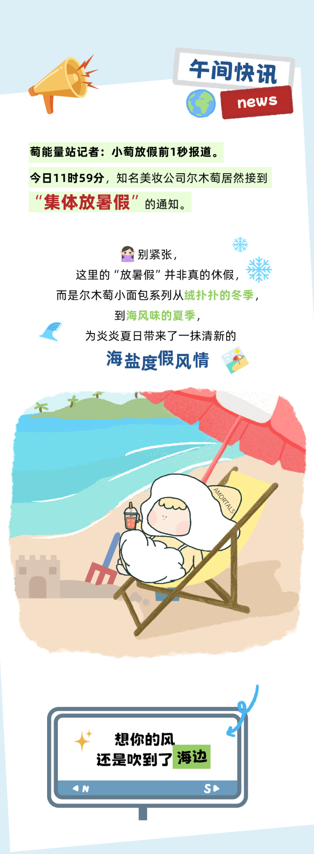 推荐:多层嵌套「点击切换后展开」宣布尔木萄小面包系列从冬季 “绒扑扑” 风格升级为夏季 “海风味”,主打清新的海盐度假主题,借此宣传尔木萄粉扑。