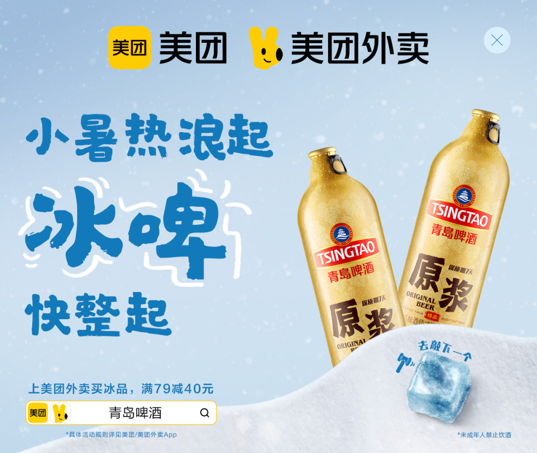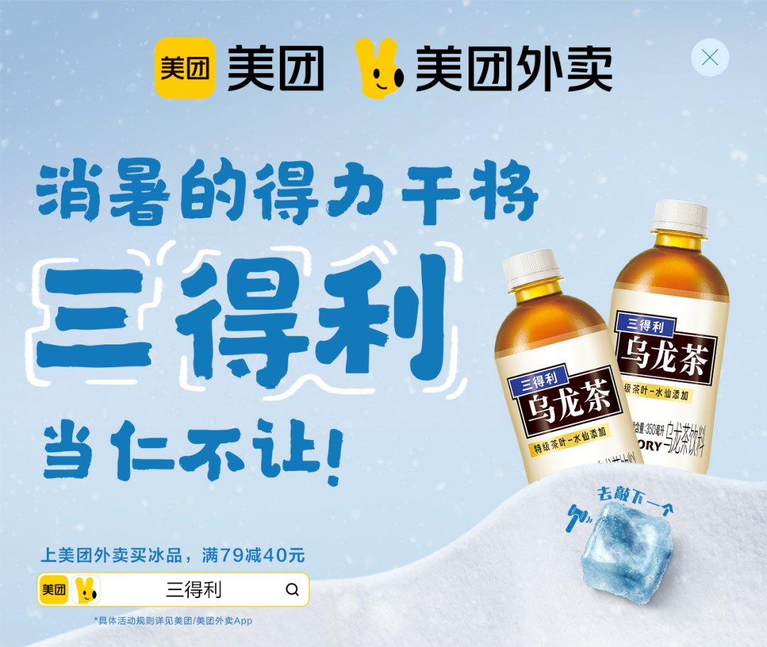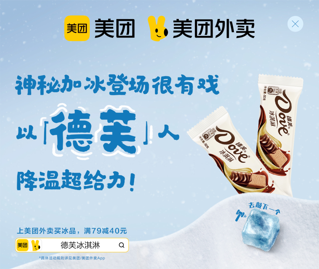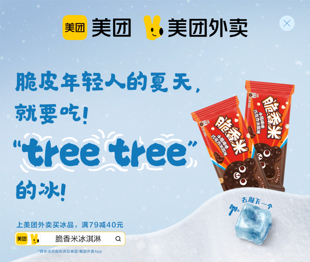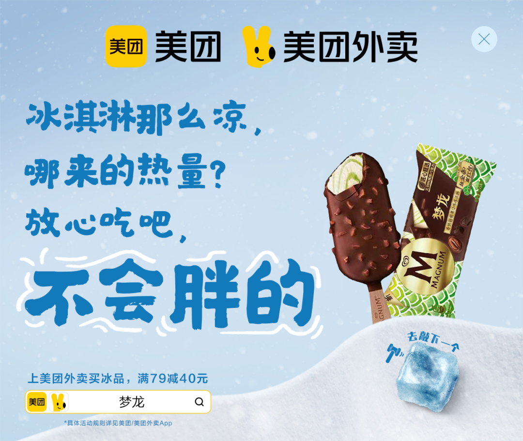 推荐:「点击消失展开」一系列冰块,借助多个平级「连续点击」的交互模拟敲冰,其中穿插音频播放和弹出图片的效果,吸引大家参与美团夏日敲敲乐挑战,借此宣传美团外卖。