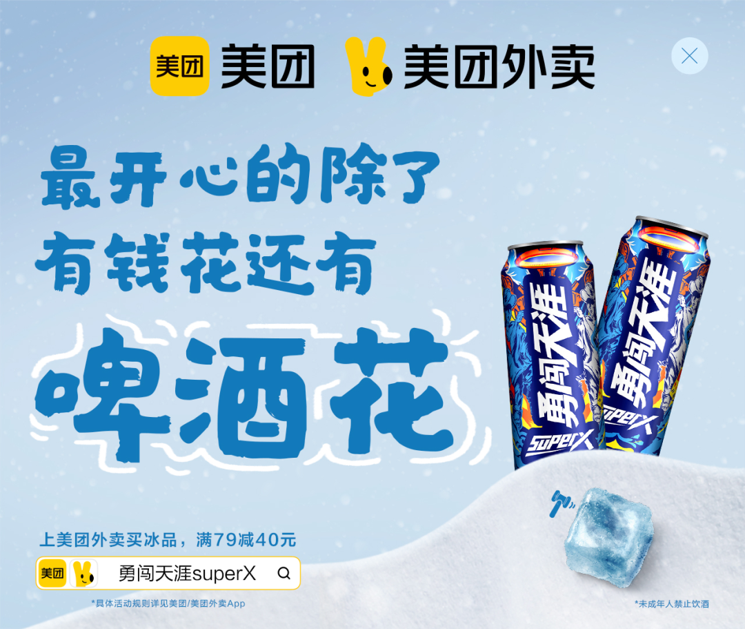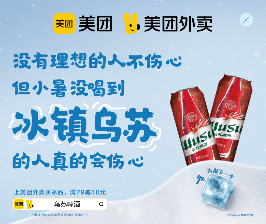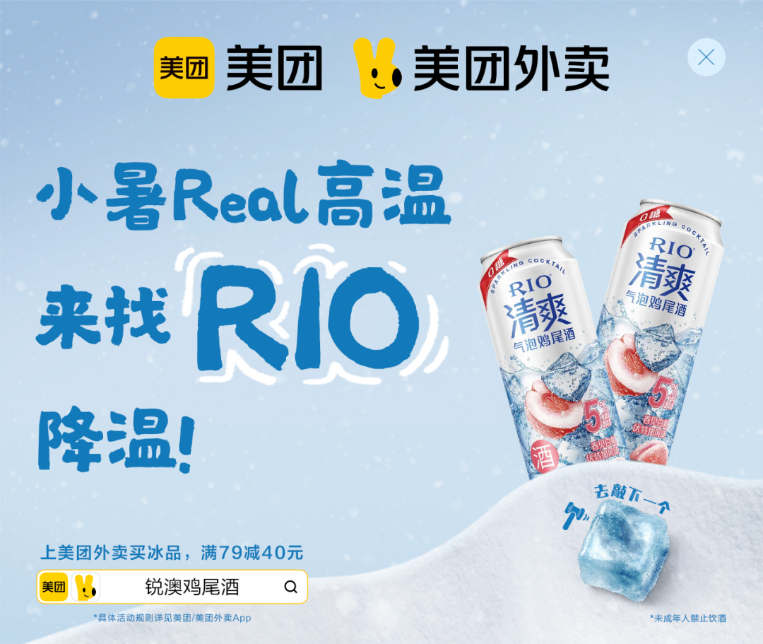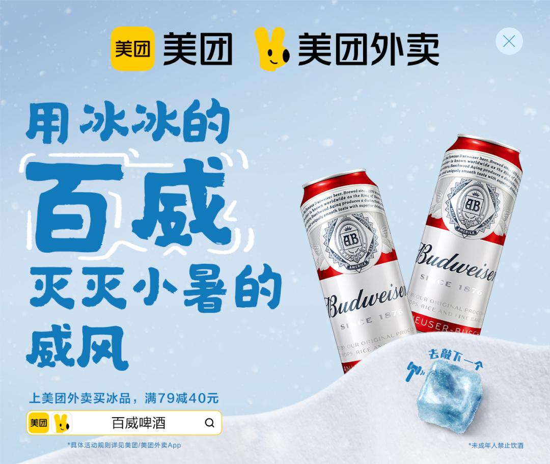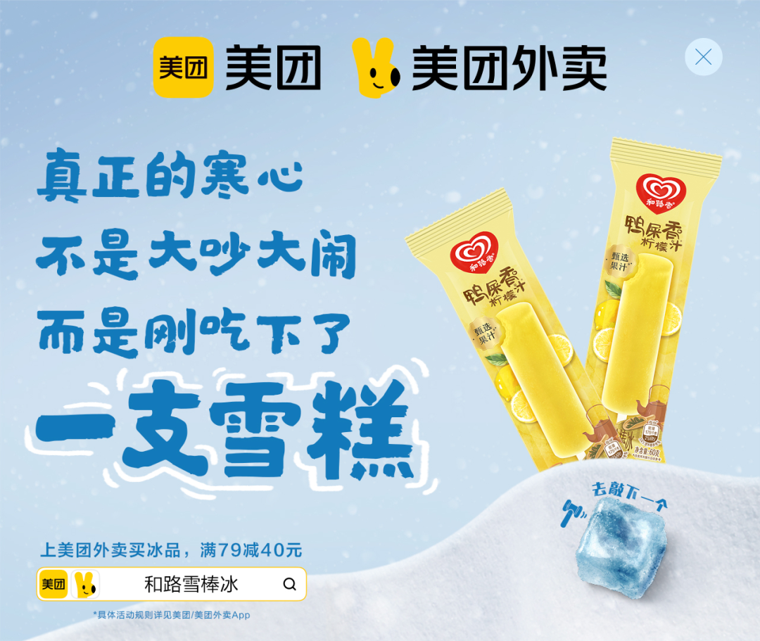 推荐:「点击消失展开」一系列冰块,借助多个平级「连续点击」的交互模拟敲冰,其中穿插音频播放和弹出图片的效果,吸引大家参与美团夏日敲敲乐挑战,借此宣传美团外卖。