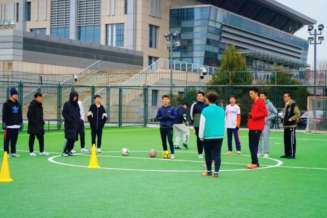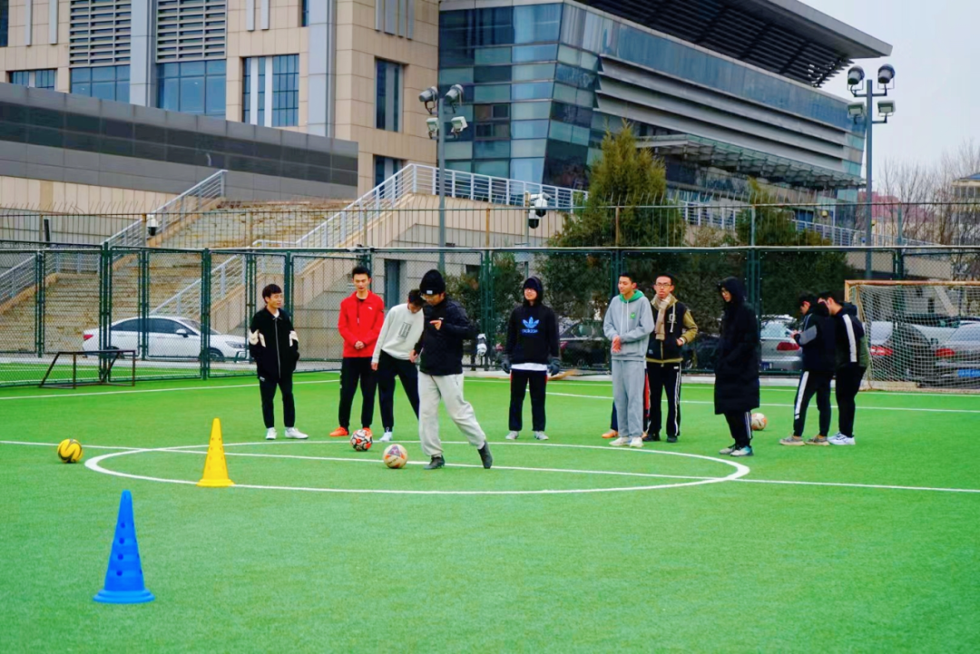 热身完毕后,球队教练哈提指导同学们如何进行脚弓传球、停球,并通过实际演示展示了正确的技巧。