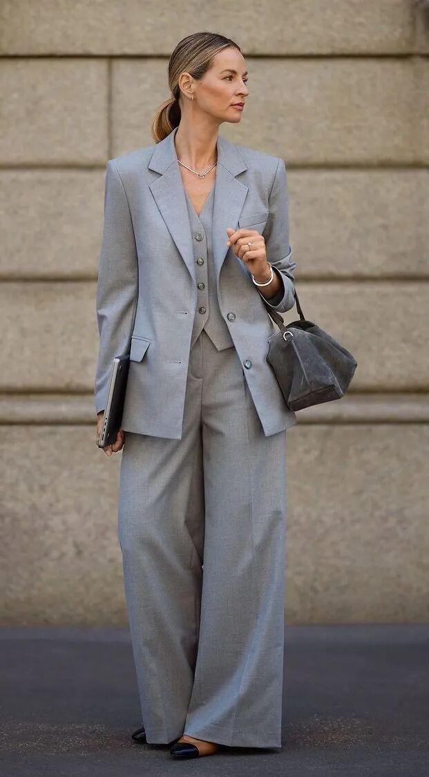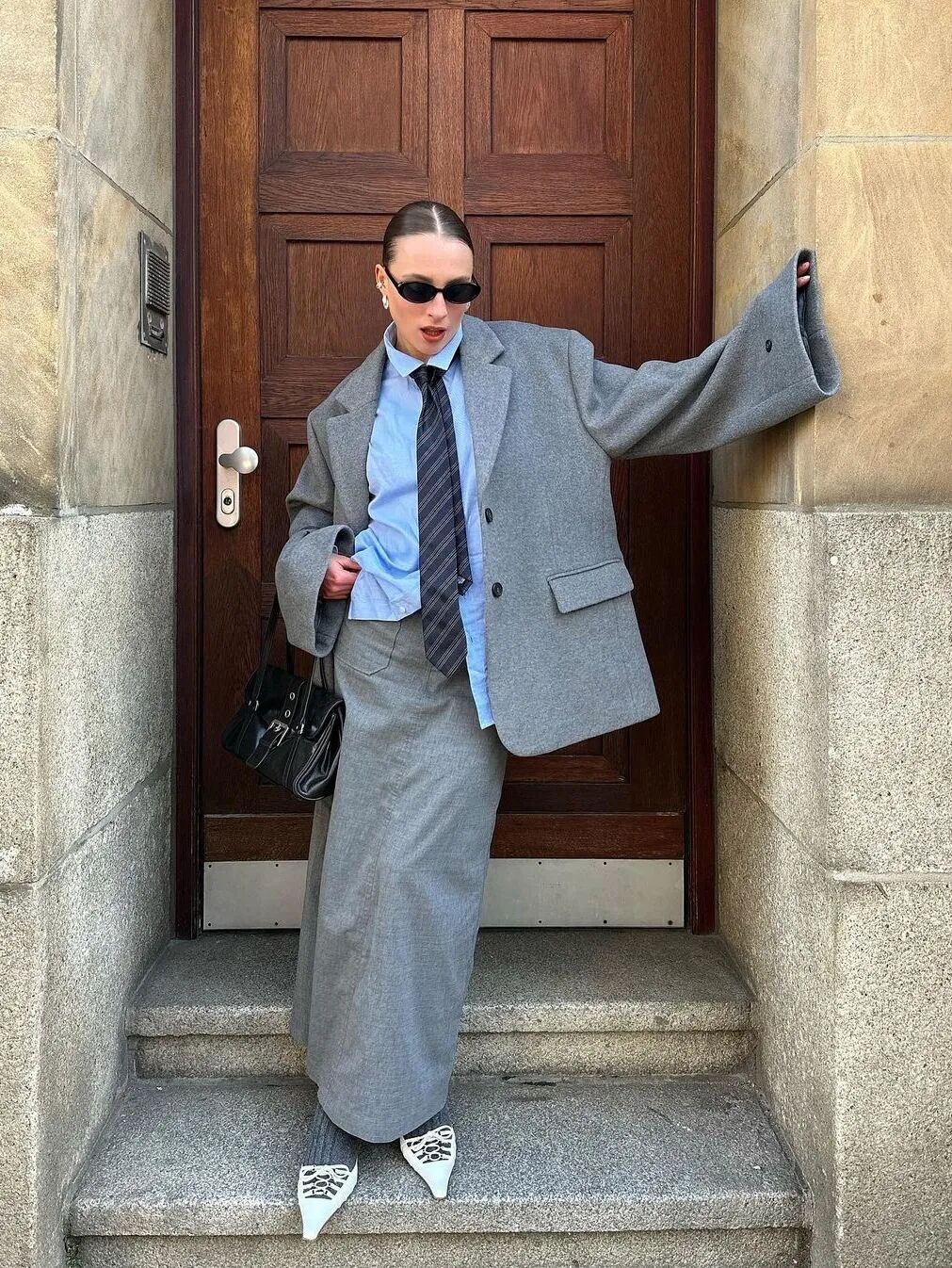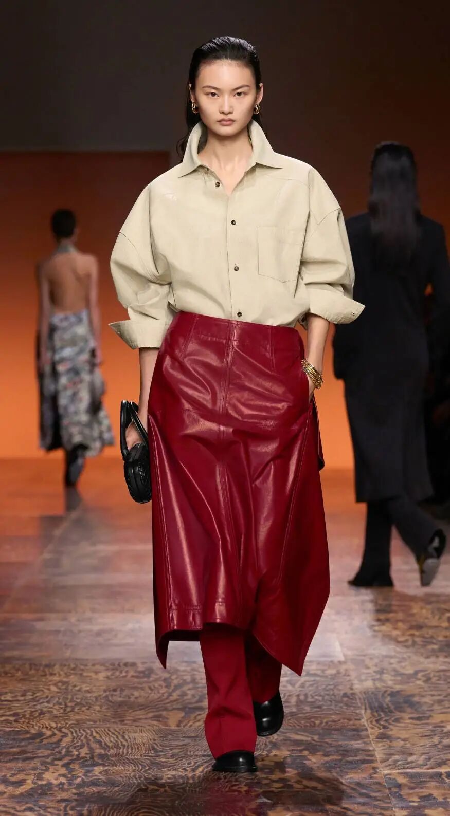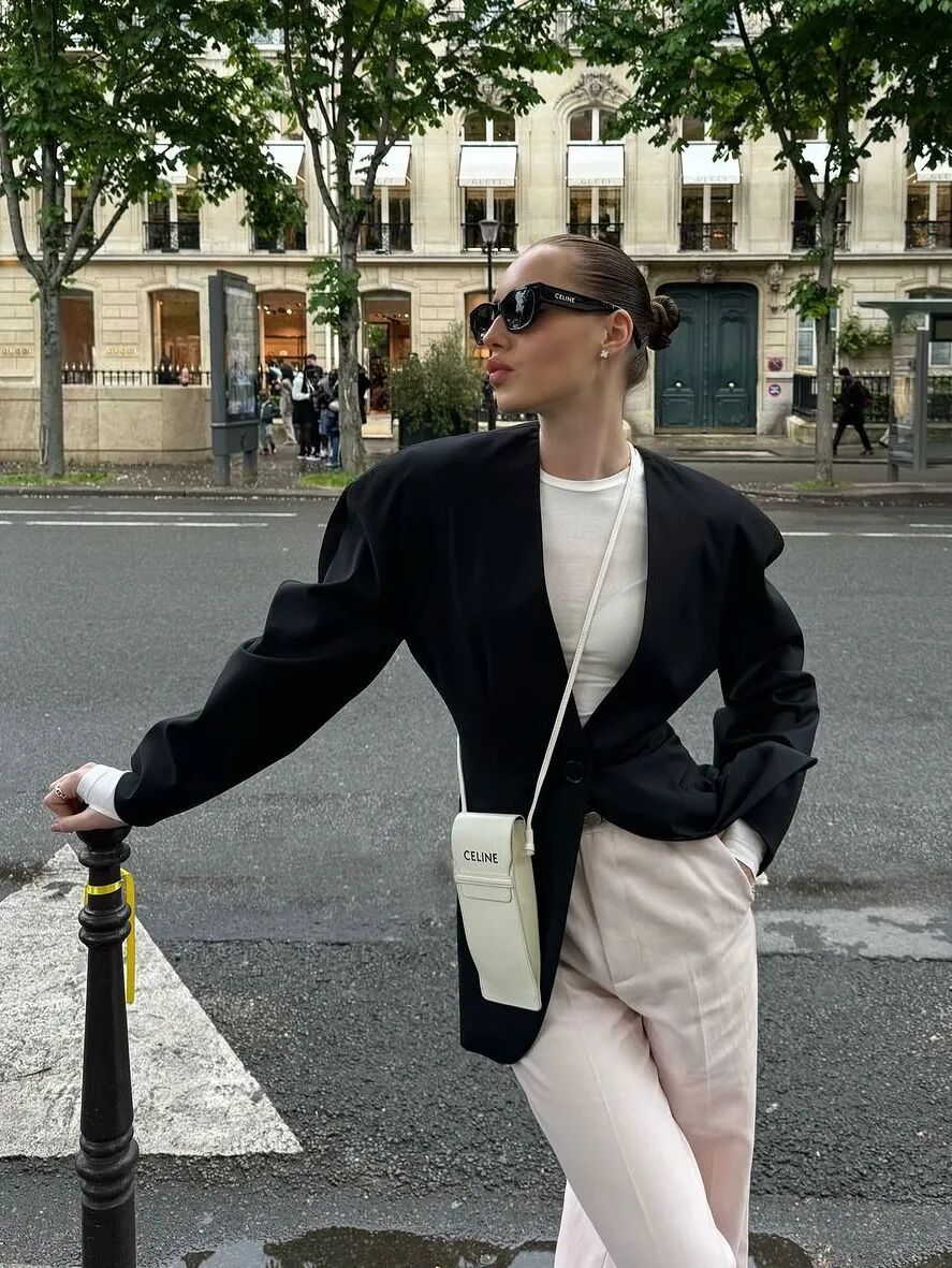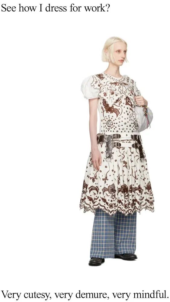 通常表示(尤指女性)端庄得体的、矜持的,或假装端庄的。在原生的英文语境中,它更加强调的是一个“装”字,用demure表示的端庄,很有可能是“又端又装”。这个对人们刻板印象中的女性形象略显嘲讽的词,在洋抖上被博主Jools Lebron一句形容自己上班穿着的“Very Demure, very mindful!”带上热搜,火遍全抖。词义也在传播中经过几重变化,最终以“端庄低调且不跟风”的Demure Fashion变为秋冬趋势热词。端庄低调而不失质感的材质、柔和自然的色调和简洁大方的设计等关键词很容易让人联想到同样具有这些特质的“静奢风”,但与后者完全不同的是,Demure想通过服装表达一种态度,它端庄但不端着,追求低调质感但并不把自己框在某一种特定模板中。退一万步讲,它可以是上班不恶心穿搭:哪怕是在工作中,也能坦然展示自己的风格和品味。想要把Demure Fashion拿捏得更自如,后半句Very Mindful也不能忽视。不同于绝大多数趋势词都会有一些代表性的单品,Demure没有界限,一千个人身上或许有一千种呈现。Mindful的意义也正在于此,让我们带着思考,在服装中注入自我意识,尽情表达或幽默或放肆的“端庄”。随着Demure一词在Google的搜索率超过300%,热度进一步发酵。Kim Kardashian用Demure形容自家品牌Skims广告的幕后花絮;Jennifer Lopez晒出自己demure地喝鸡尾酒的样子;时尚购物网站SSENSE更是非常直接地用一张带有Slogan的图片来推广独立设计师品牌Chopova Lowena,花卉、铆钉、皮革等嬉皮元素在优雅的A字Lady裙廓形上呈现,这些都是Demure想要传达的自由和有趣。不过,这个热度不是谁都能贴得上。由于Demure语义中自带反讽意味,不对味儿的风格硬蹭很有可能会被看作是真的“嘲讽”。正确的打开方式可以是像Miu Miu一样用俏皮的玛丽珍鞋、优雅的珍珠项链和巨大的手套让黑色套装变得不再严肃;可以是Victoria Beckham和Tory Burch建筑廓形感剪裁和丝袜轻薄清透材质的柔软碰撞;也可以是Bottega Veneta简洁硬朗中一抹大胆的亮色。上:Miu Miu 2024秋冬、Victoria Beckham 2024秋冬下:Bottega Veneta 2024秋冬、Tory Burch 2024秋冬如果要用一些人来形容Demure,那么《艾米丽在巴黎》里的女上司Sylvie和穿上The Row的Kendall Jenner可以成为代表,二人都能把看似简单的衣服穿出强烈的个人风格。左:Sylvie 右:Kendall Jenner前者擅长把生动的细节融入优雅的基础套装中,在端庄底色中用空气感的泡泡袖、围巾、大体积金属配饰等强调个性。后者从商业模特成为女企业家,穿衣风格也随之产生变化,Crop和瑜伽裤被替换为更具质感的风衣、中长裙,但剪裁依旧是凸显曲线的肯式美学。在不同人身上,Demure所呈现出的状态是完全不同的,这也正是这个热词想要传达的观点。“端庄”没有固定解,人们似乎更应该找到自己的方式去诠释自我。可以是针织和百褶的松弛,可以是皮革和丝缎的刚柔并济,可以是Oversize的气势,当然也可以是直筒裙和棒球帽的玩趣。相比于一板一眼的潮流趋势,Demure Fashion更像是一种生活方式。它让人们思考什么是自我,在各种流动的chic和core中精准定位到自己的舒适区,逃离瞬息万变的流行词,不跟风、不一味追求奢侈,将关注点放在自己身上,用低调利落的态度对待平凡日常中的每一个时刻。