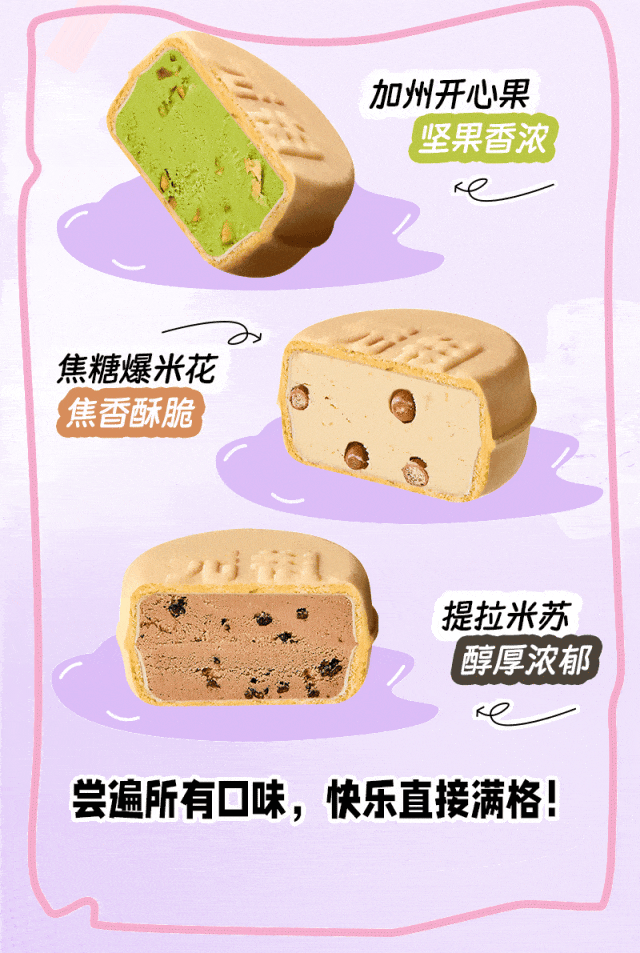 推荐:「点击切换GIF后消失展开」搭配轻薄酥脆的欧式威化饼皮,有加州开心果、焦糖爆米花、提拉米苏等口味。