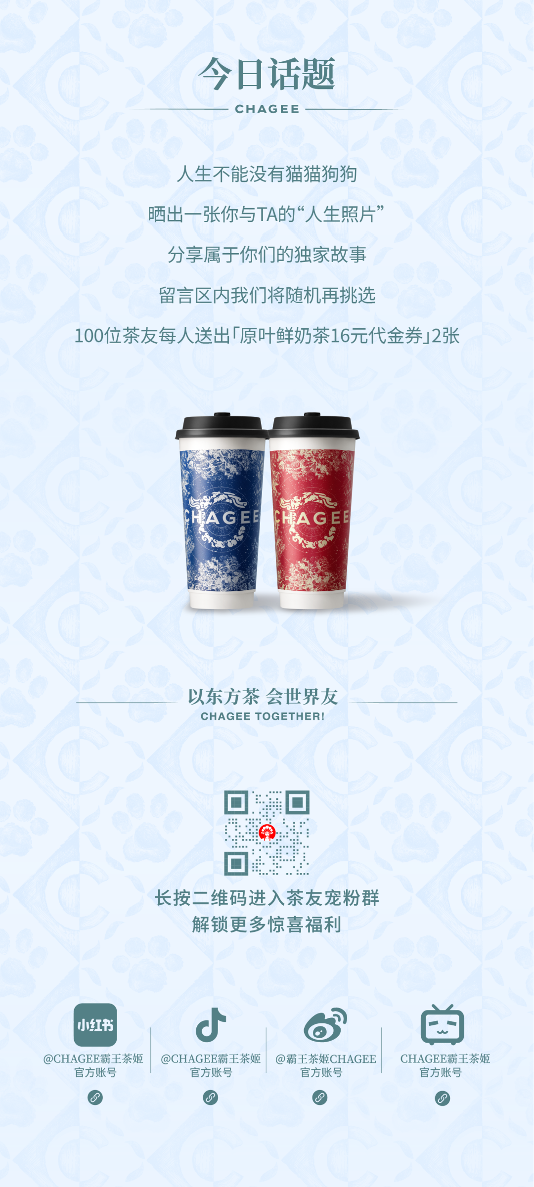 两个月前,公司“入职”了一只特别的伙伴,一只刚足月的狸花猫。是人资部门某个热心同事,从上海某个湿冷的角落小心翼翼捧回。初来时,它孱弱得甚至站不稳当,又因为年纪太小分不清性别,所以也还没有名字。暂且把它称之为霸王茶姬的吉祥物吧。作为司宠,不知不觉成为了大家在工作之余放松的解压搭子。我们在忙碌的间隙被它的纯粹萌态所治愈,而它,也在无数温暖的掌心接力中,一天天茁壮成长,它甚至有自己的“说明书”以及“每日办公日程表”。养过宠物的人都知道,只要有了一只小猫,就会有无数小猫在手机相册疯狂生长。被小猫陪伴过的我们,用镜头捕捉下「霸王茶姬吉祥物」的一天,它时而慵懒、时而神秘、时而调皮...每一张照片的背后,都记录着我们和它相伴的点滴瞬间。就在两周前,又一个意外之客不请自来,一只中等体型的鸟,蓝绿色,长尾巴。它落在椅背上,毫不怯生,没有啼叫,没有惊慌,抖抖尾羽,翘翘屁股,仿佛整个办公室只是棵树,椅背是一根稳当的树枝,它只是来串门而已。它在办公室大摇大摆,时而停在屋檐的隔断上,用神气的小表情俯视下方;时而大胆地飞到某个同事的办公桌前的隔板,歪着脑袋好奇地打量一番又飞去其他角落。我们把照片发公司大群里扩散“谁家的小可爱迷路了?”,但迟迟未有人认领。彼时,宠物项目上线前的空气绷得像拉满的弓弦,流程、设计、物料、活动方案……千头万绪亟待梳理。某个伙伴看着它,幽幽的说了一句:这是虎皮鹦鹉,是天降祥瑞!就这一句,紧绷的空气霎时松动,办公室里先是安静了两秒,接着漾开一阵释然的笑声,大家相视而笑,有一种奇妙的轻松感。这个略显焦灼的午后,这只迷途的鹦鹉,像是命运送来的一份恰到好处的慰藉。茶水间里,袅袅茶香氤氲。有人捧着伯牙绝弦,看猫蜷在膝头满足地打着呼噜,有人忍不住和身边的人闲聊分享自己养的“逆子”,也有许多茶友们在网上和我们分享了许多属于他们之间的故事。茶,是日常的慰藉,是片刻宁静的载体,而这些小生命带给我们掌心的温暖与生命的灵动,则成了这份宁静中最生动的注脚。这些故事,没有惊天动地的情节,只有真实生活的毛边——是深夜归家门口的那盏灯(或那团毛球),是视频电话里熟悉的叫声,是低落时一个无声的依偎,是病痛中依然笨拙的示好。原来忙碌的工作之余,还有这么多人在悄悄守护着一份毛茸茸、暖烘烘的牵挂。这些小小的生命,用它们最纯粹的存在方式,成为我们对抗生活庸常与压力的锚点,提醒我们何为“被需要”的柔软,何为“不孤独”的踏实。当我们在谈论毛孩子的时候,我们说的是陪伴和治愈,是回家见到小狗时它的雀跃与迫不及待的拥抱、是柔软又毛茸茸的小猫身躯依靠在身边的那份安定与温暖、是彼此一起走过生命中的点点滴滴,成为独一无二的“好朋友”,我们给予它们庇护,它们则回馈我们毫无保留的信任与以来,这种双向的陪伴与治愈,让忙碌的日常有了喘息的时刻。人与茶的连接,是味蕾的享受与片刻的沉淀;宠物与人的羁绊,是无声的陪伴与纯粹的信任;而人与人之间,则因共同关注、照料这些小生命,因分享彼此生命中那些同样柔软、同样需要被珍视的角落,在忙碌的工作日常中,滋生出更多真诚的理解、质朴的关怀与温暖的共鸣。霸王茶姬,以东方茶,会世界友,期待以这一杯东方茶,遇见更多围绕生命与陪伴而自然生发的联结,成为了一个更温暖、更鲜活的品牌。自23年开始,我们陆续在全国设置了宠物友好门店,让茶友们在品尝一杯好茶的同时,享受更多人与宠的陪伴时光;去年8月,我们开启了CHAGEE宠物月,选择以生命中的「萌友们」为设计灵感进行包材的升级,用一杯「伯牙绝弦」记录这些属于毛孩子们的美好瞬间;今年,我们依旧将宠物月提上了日程。8月8日,国际猫咪日之际,我们希望能遇见更多关于猫猫狗狗们与你的故事,用这杯好茶,陪伴更多好朋友们的每个会友瞬间。让“陪伴”——不再只是是茶与人的联结,更是我们与「茶友」、「萌友」的共同奔赴。因此,在这个宠物季项目温暖开启前夕,我们也诚挚地向每一位茶友发出邀请:沏上一杯你爱的茶,和我们分享你与家中(或记忆中)那个毛茸茸的故事吧!参与分享将有机会解锁萌宠亮相城市大屏、宠物全家福写真、新「宠物好朋友系列」周边礼包等多重好礼。关于它是如何早有预谋或突如其来地走进/闯进了你的生活?或者关于那些或搞笑、或暖心、或令人哭笑不得的日常碎片,如何点亮了你的某个瞬间?再或者那份真实的陪伴,又曾在何时,以何种方式,治愈了你的疲惫或孤单?亦或是用蹭裤腿时留下的软软的毛说早安,把想念藏进叼来的拖鞋和玩具里?.....*更多征集活动细节详情见CHAGEE霸王茶姬官方小红书/微博官方账号。我们相信,每一份陪伴都值得被记录,每一个分享都是对那份纯粹羁绊的温柔致敬。让我们共同编织一本关于 “陪伴” 的故事集,希望在即将到来的全新CHAGEE宠物季,能将这份温暖陪伴传递到你的手中,更多惊喜,8月17日见!霸王茶姬,好朋友一直在一起,CHAGEE TOGETHER!