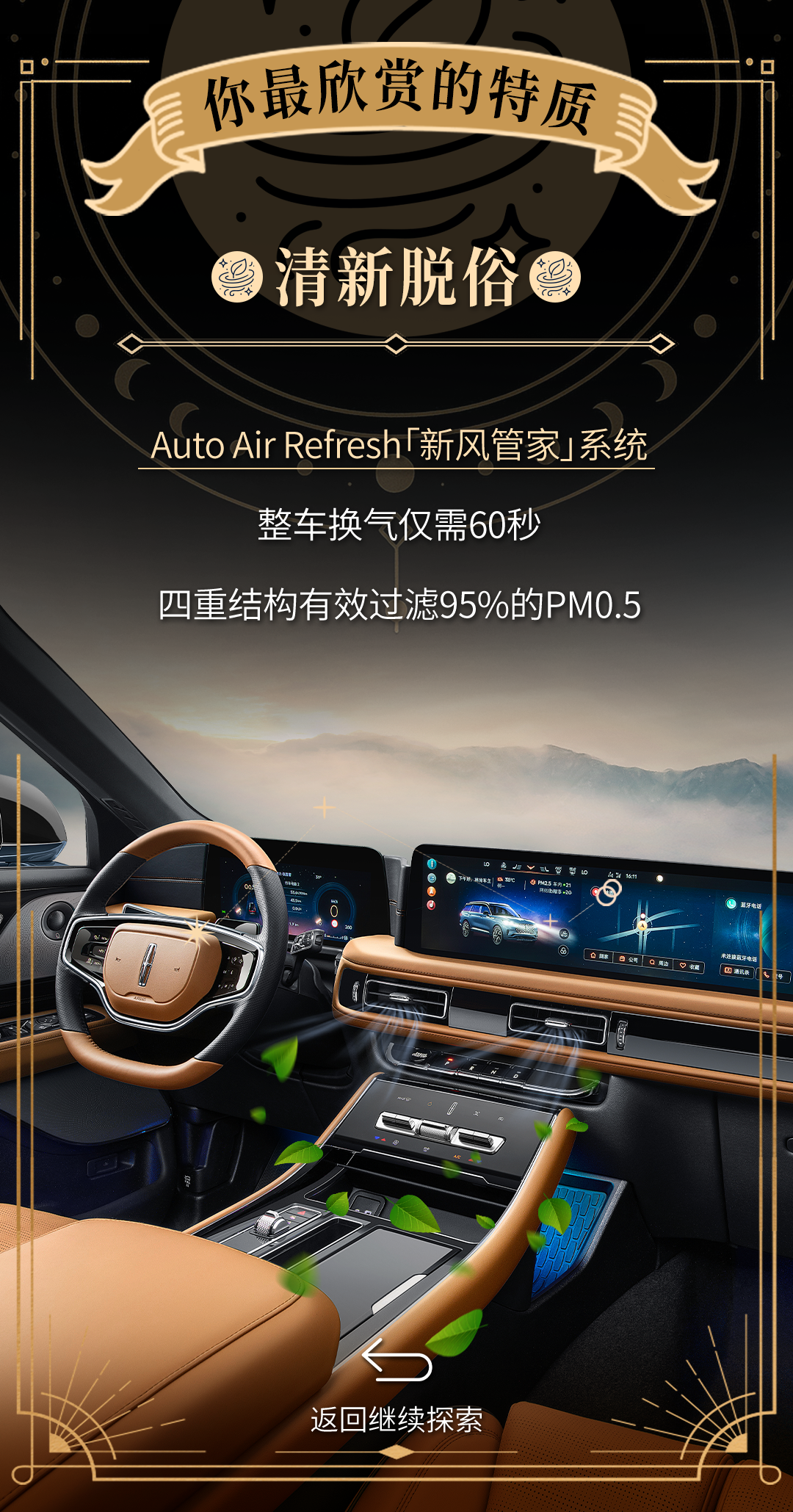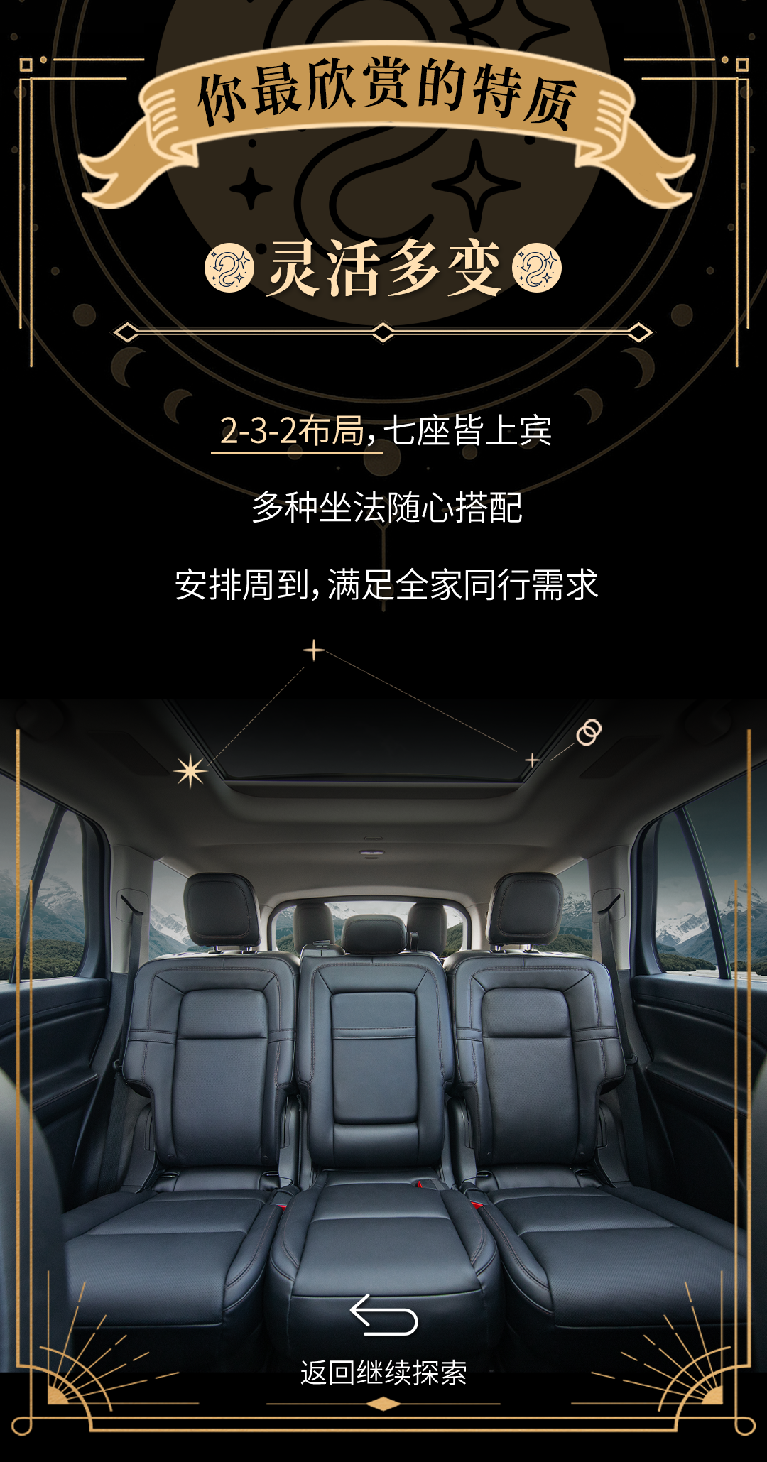 推荐:「自动展开」林肯飞行家「大七座」汽车的介绍,「点击弹出」查看强动力、大空间、灵布局、高安全,兼舒适、静谧、净空气与智能辅助驾驶等功能,借此宣传林肯汽车,吸引读者前往试驾。