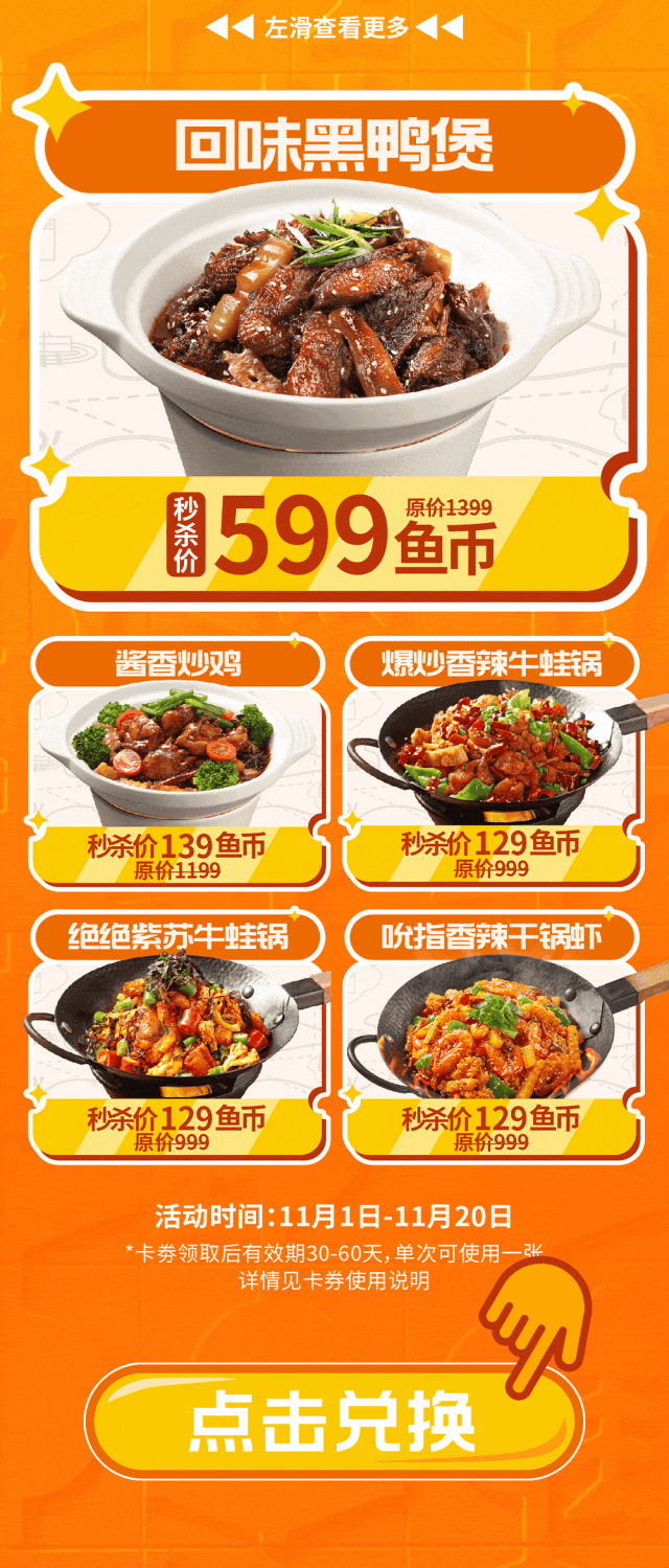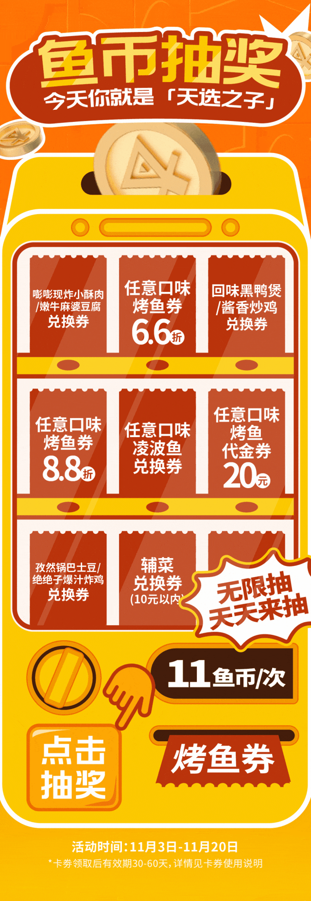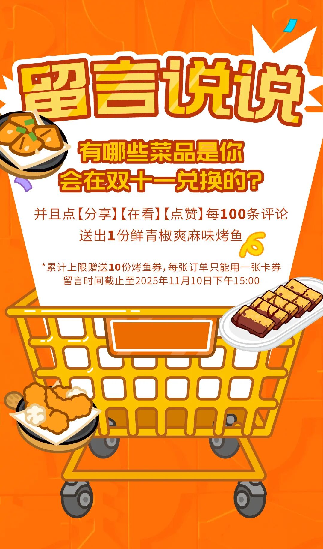 注:1.推文留言活动时间:2025年11月3日-2025年11月10日,2025年11月11日将在留言区公布留言中奖名单,奖品为鲜青椒爽麻味烤鱼一份;2.奖品以卡券形式发放至会员卡包,具体卡券有效期与使用规则,可在【探鱼烤鱼】小程序 -【我的】-【优惠券】卡券详情中查看;3.仅限大陆地区探鱼餐厅堂食使用,华为店不参与活动;4.每个订单仅可使用一张卡券,不可与其他优惠同享,餐前不设外带;