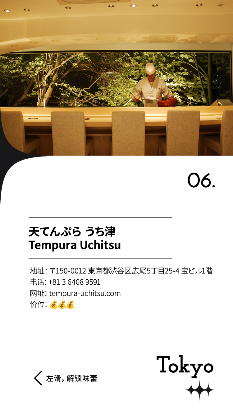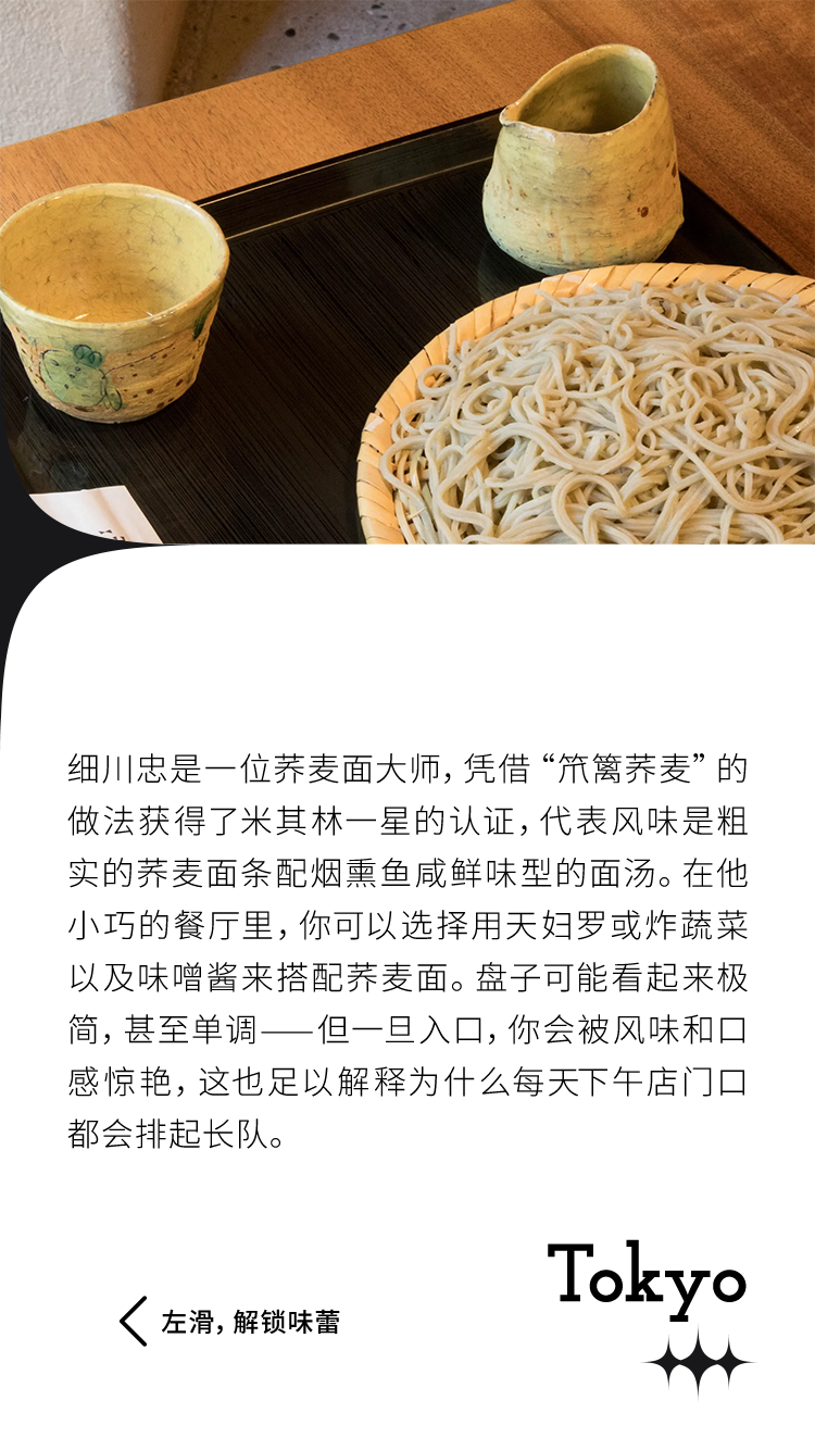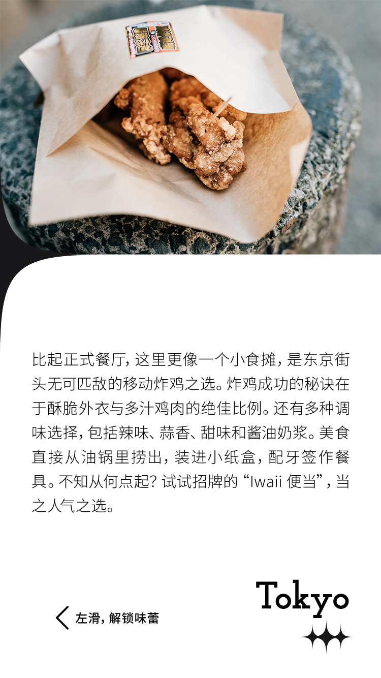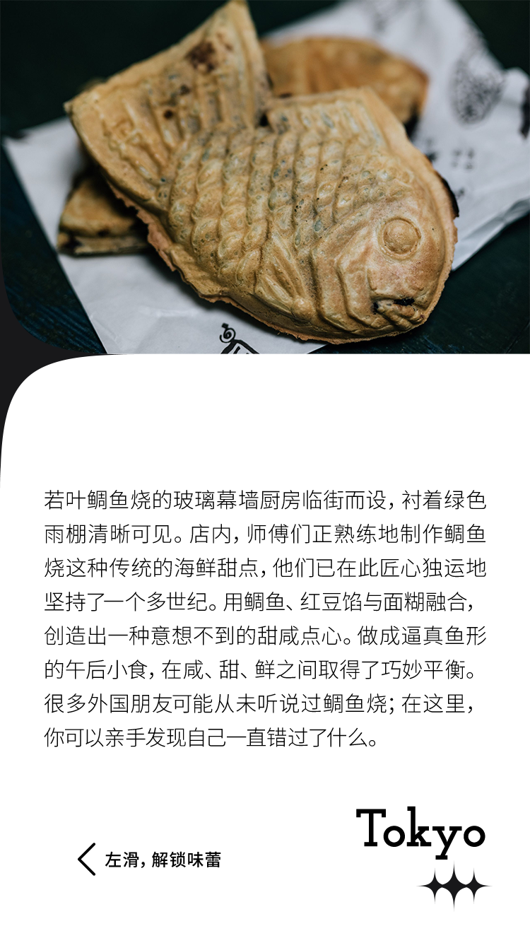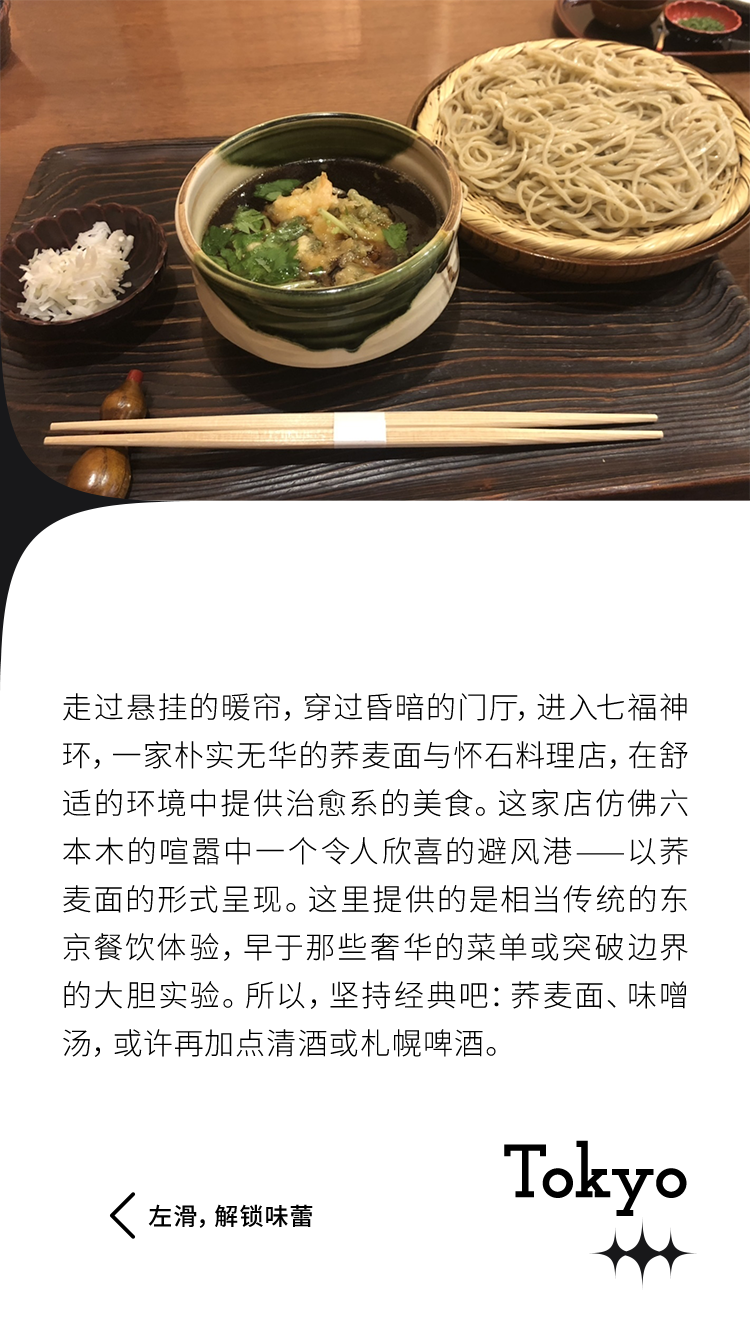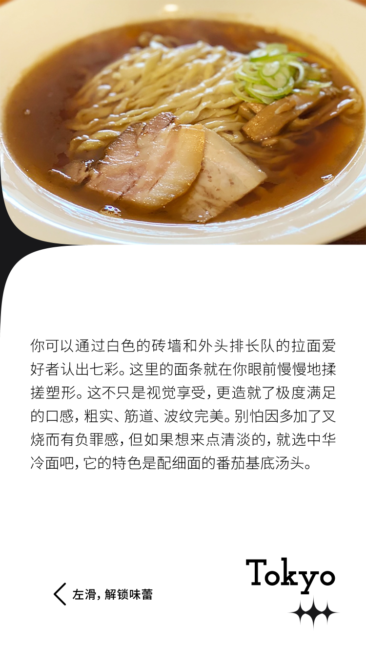 推荐:悦游CNTraveler通过「拖动光圈点击切换」的交互方式为大家推荐东京本地人标记的美食地图,「上滑」或者「左滑」来查看更多酒店,借此吸引读者前往打卡。