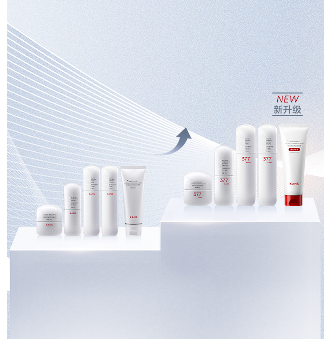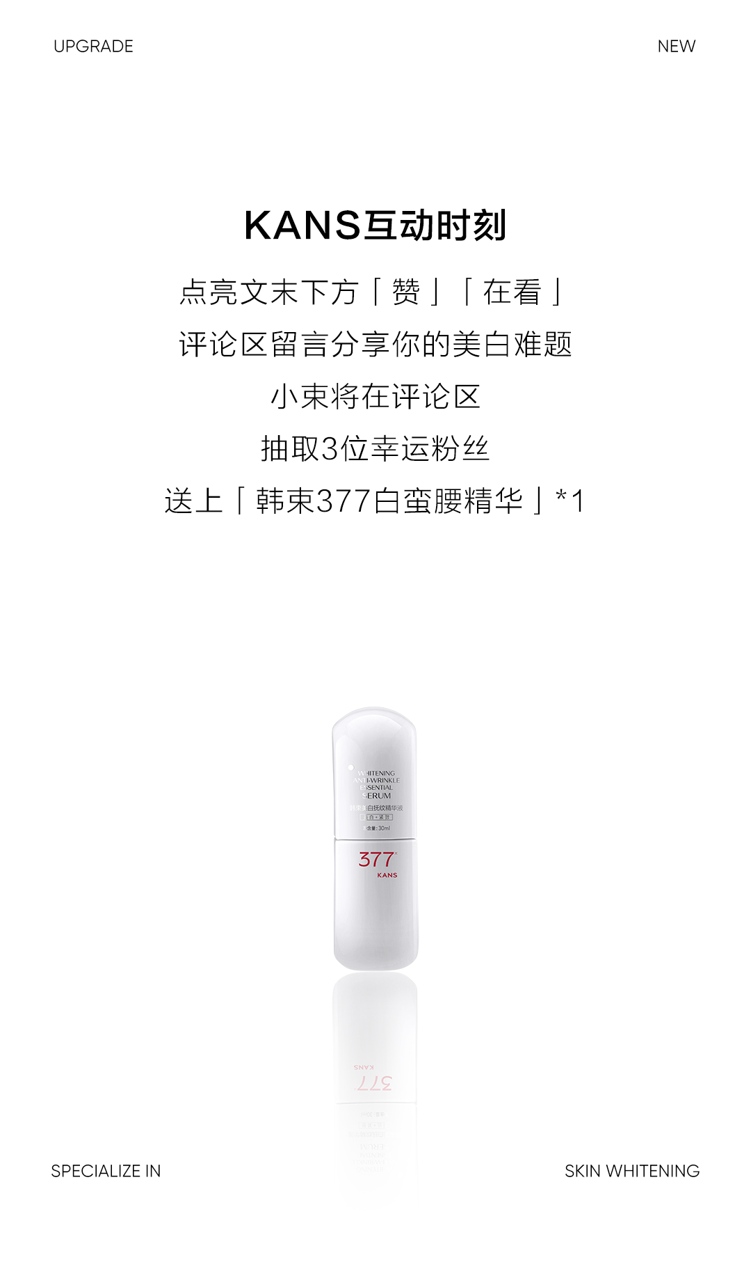 推荐:「点击切换后消失展开」推出升级款 “377 白蛮腰” 美白系列,强调 “14 天白・嫩・透・亮”,主打三大升级,含科研成分,借此宣传韩束 KANS “377 白蛮腰” 美白系列,吸引读者前往购买。
