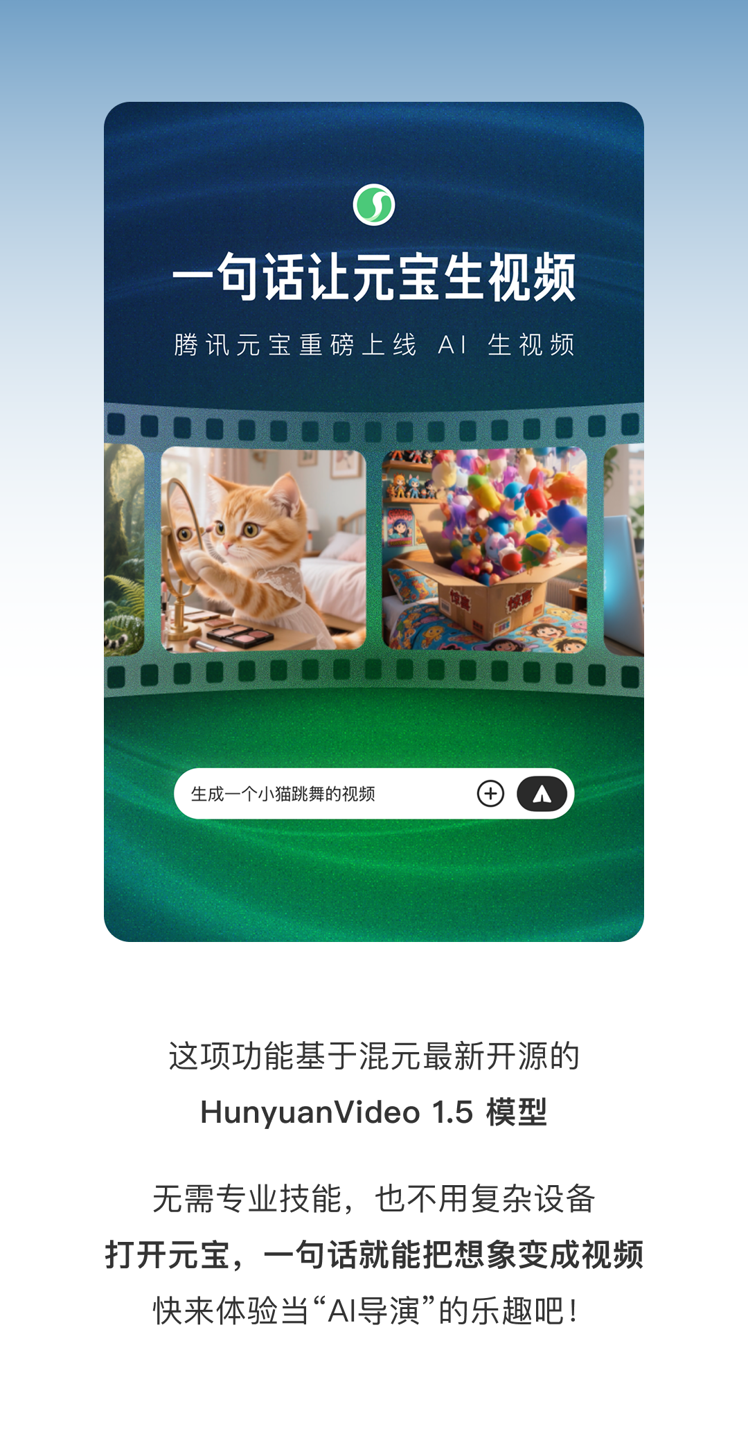 推荐:「点击切换GIF动图后左滑」介绍重磅上线 AI 生视频功能,基于混元开源的 HunyuanVideo 1.5 模型,支持 “一句话、一张图生成视频”,无需专业技能,引导用户下载元宝 App、电脑版或浏览器插件,